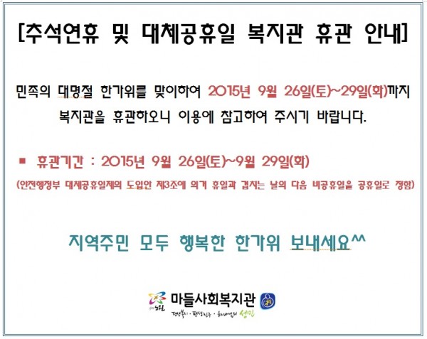 추석연휴 및 대체공휴일 휴관 안내 페이지 정보 작성자 마들사회복지관 작성일15-09-18 15:08 조회13,730회 댓글0건 관련링크 이전글 다음글 목록 본문 댓글목록 등록된 댓글이 없습니다. 이전글 다음글 목록