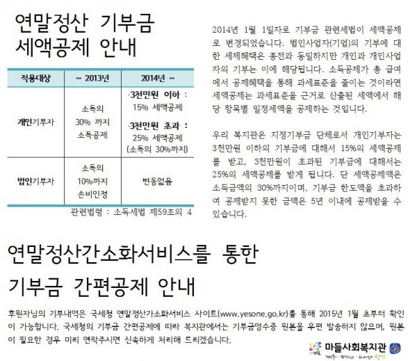 2014년 연말정산 기부금 간편공제 안내^^ 페이지 정보 작성자 고효영 작성일14-12-26 13:33 조회13,378회 댓글0건 관련링크 이전글 다음글 목록 본문 담당자 : 고효영 사회복지사 02-971-8387~8 댓글목록 등록된 댓글이 없습니다. 이전글 다음글 목록