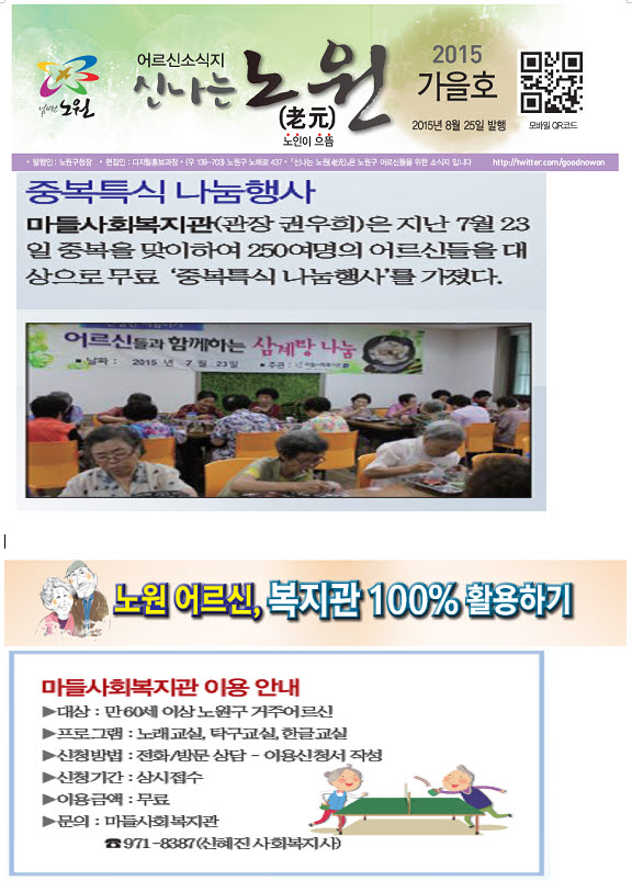 2015년 노원구청 어르신소식지(가을호)에 마들사회복지관 중복특식 나눔행사와 어르신 프로그램안내가 함께 소식지에 등재되었습니다.