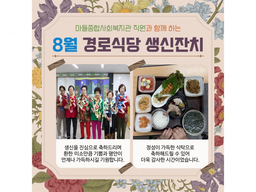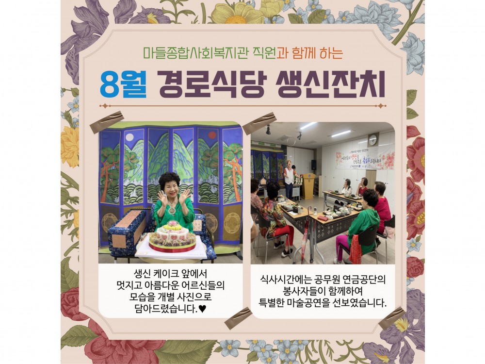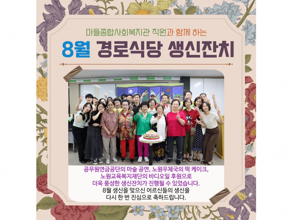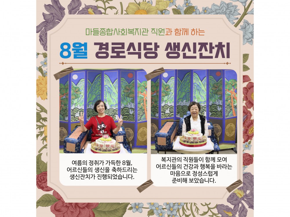 8월 경로식당 생신잔치 "함께라서 더 행복한 생일" 페이지 정보 작성자 서비스1팀 작성일25-08-20 15:22 조회904회 댓글0건 관련링크 이전글 다음글 목록 본문 #폭염 #날씨 #태픙* 이 디자인은 미리캔버스에서 작업되었습니다.(https://www.miricanvas.com) 댓글목록 등록된 댓글이 없습니다. 이전글 다음글 목록