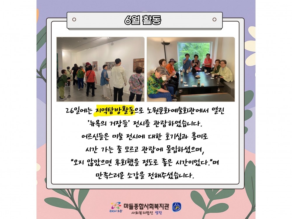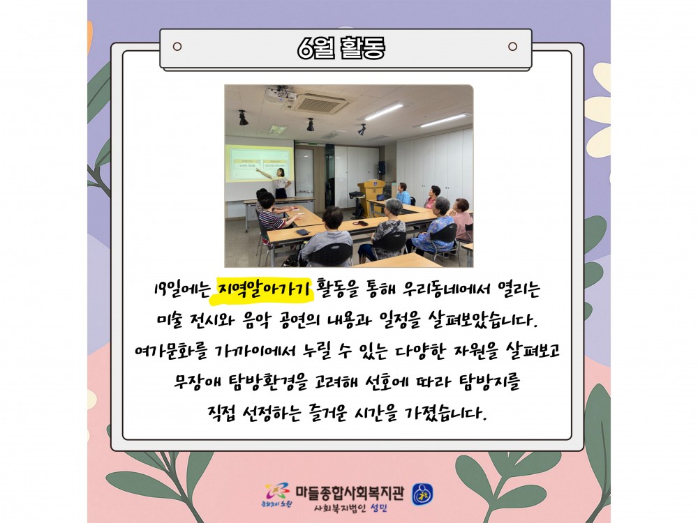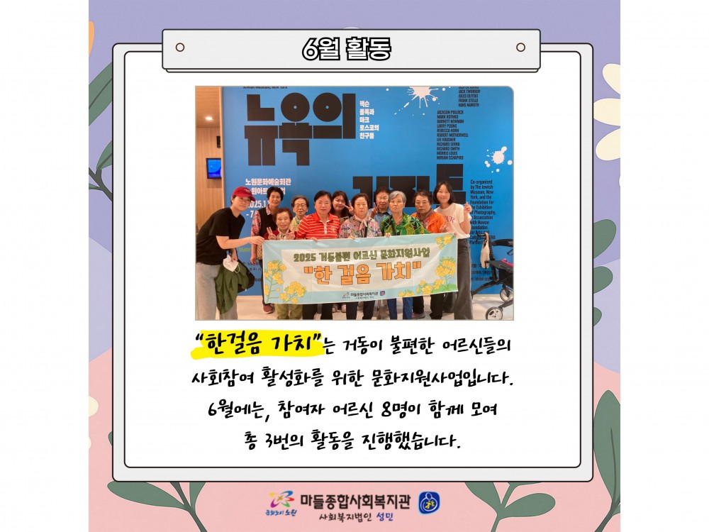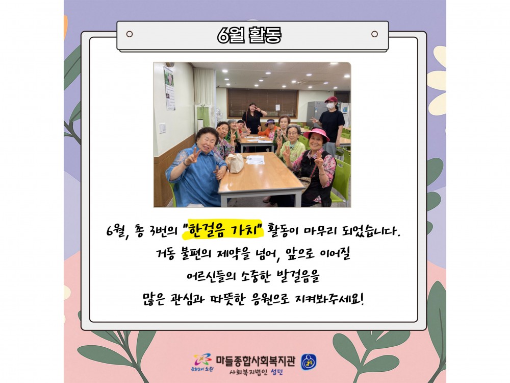 거동불편어르신 문화지원사업 '한걸음가치' 6월 활동 페이지 정보 작성자 서비스1팀 작성일25-06-30 18:22 조회904회 댓글0건 관련링크 이전글 다음글 목록 본문 #어린이날 #어버이날 #가정의달* 이 디자인은 미리캔버스에서 작업되었습니다.(https://www.miricanvas.com) 댓글목록 등록된 댓글이 없습니다. 이전글 다음글 목록