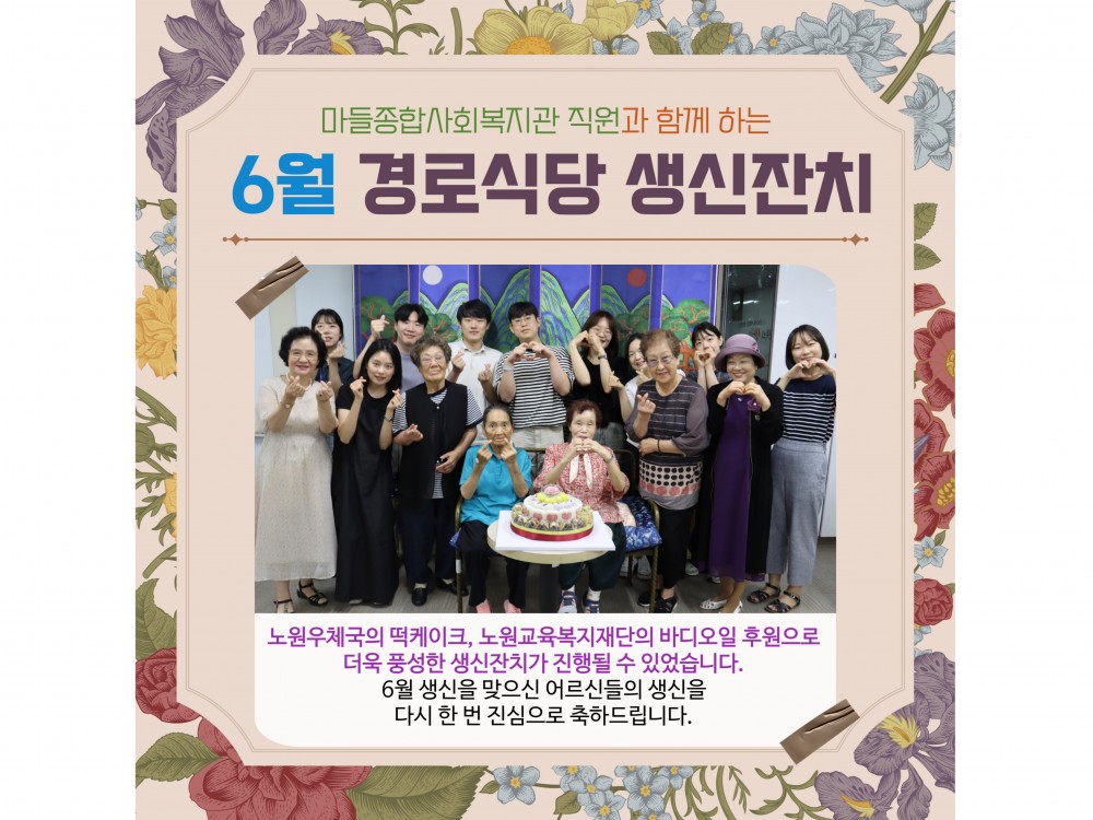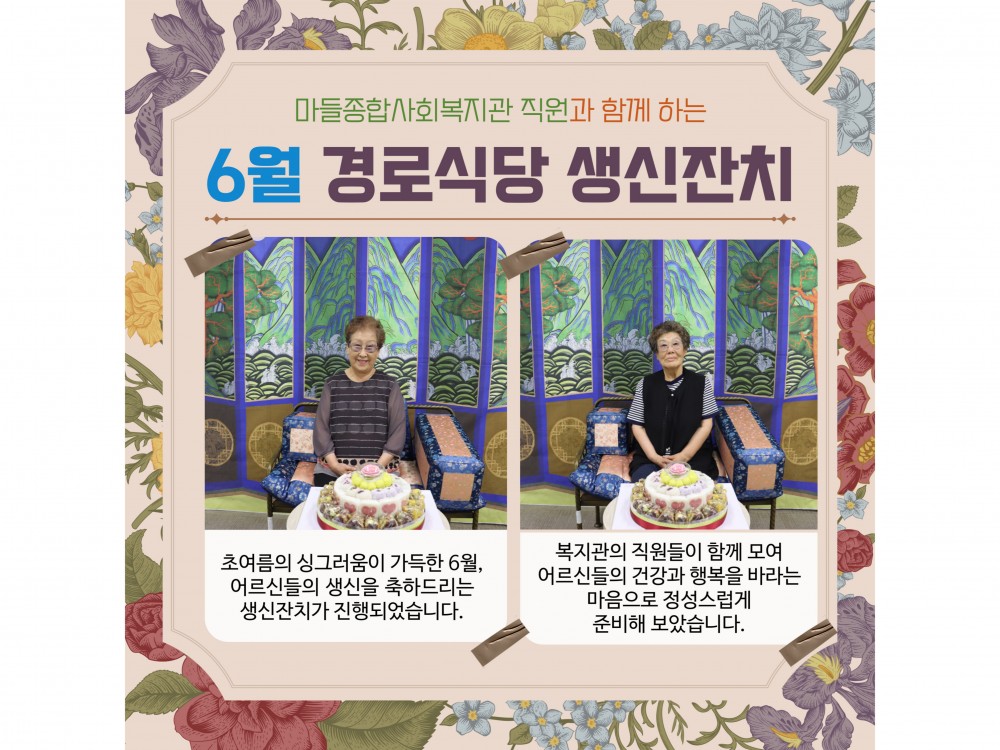 6월 경로식당 생신잔치 "함께라서 더 행복한 생일" 페이지 정보 작성자 서비스1팀 작성일25-07-01 17:59 조회1,040회 댓글0건 관련링크 이전글 다음글 목록 본문 #어린이날 #어버이날 #가정의달* 이 디자인은 미리캔버스에서 작업되었습니다.(https://www.miricanvas.com) 댓글목록 등록된 댓글이 없습니다. 이전글 다음글 목록