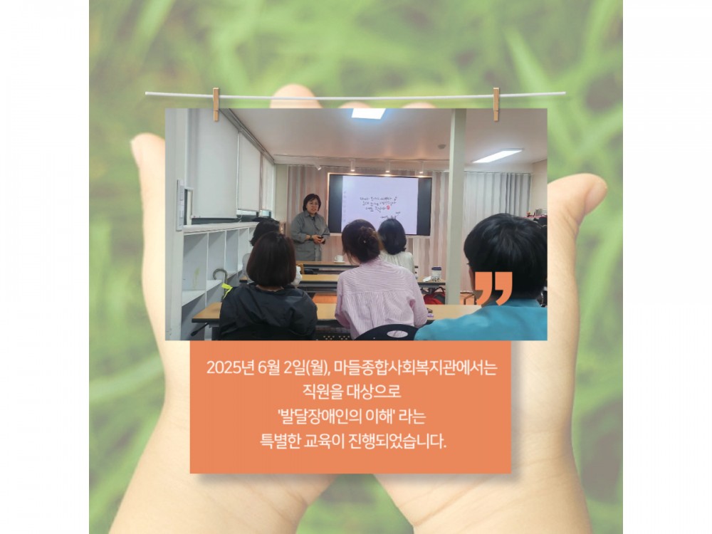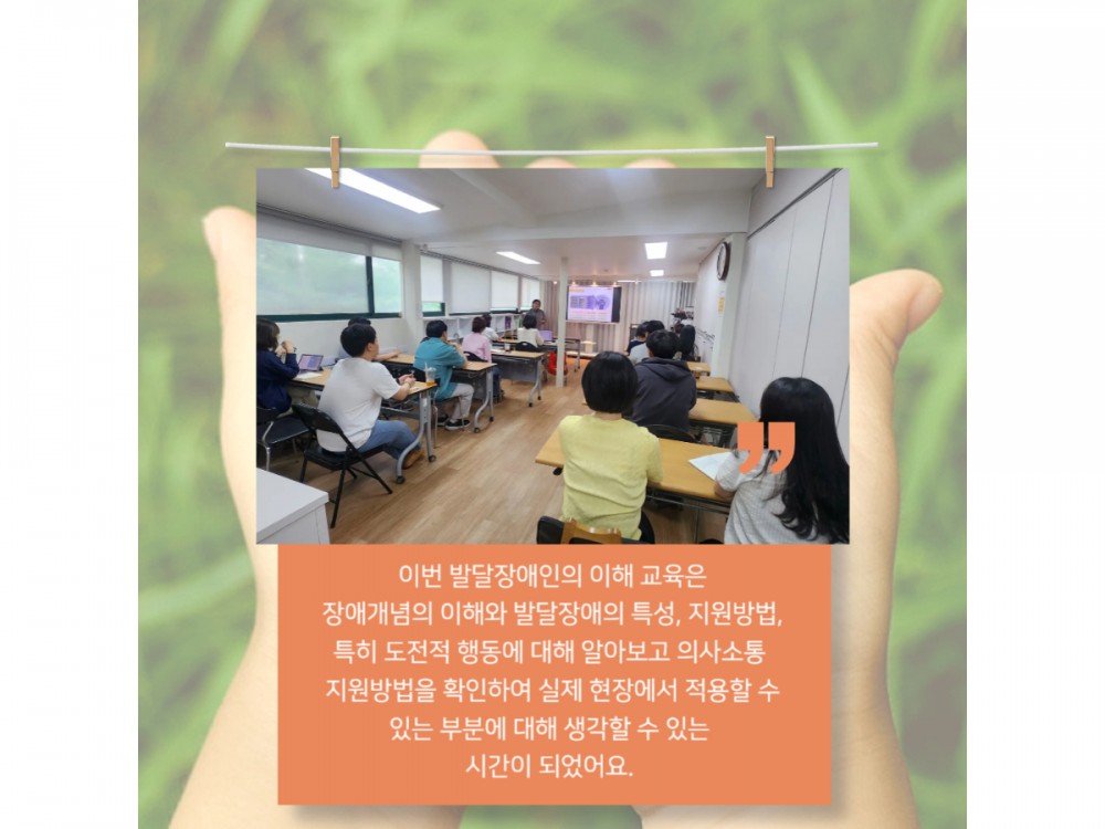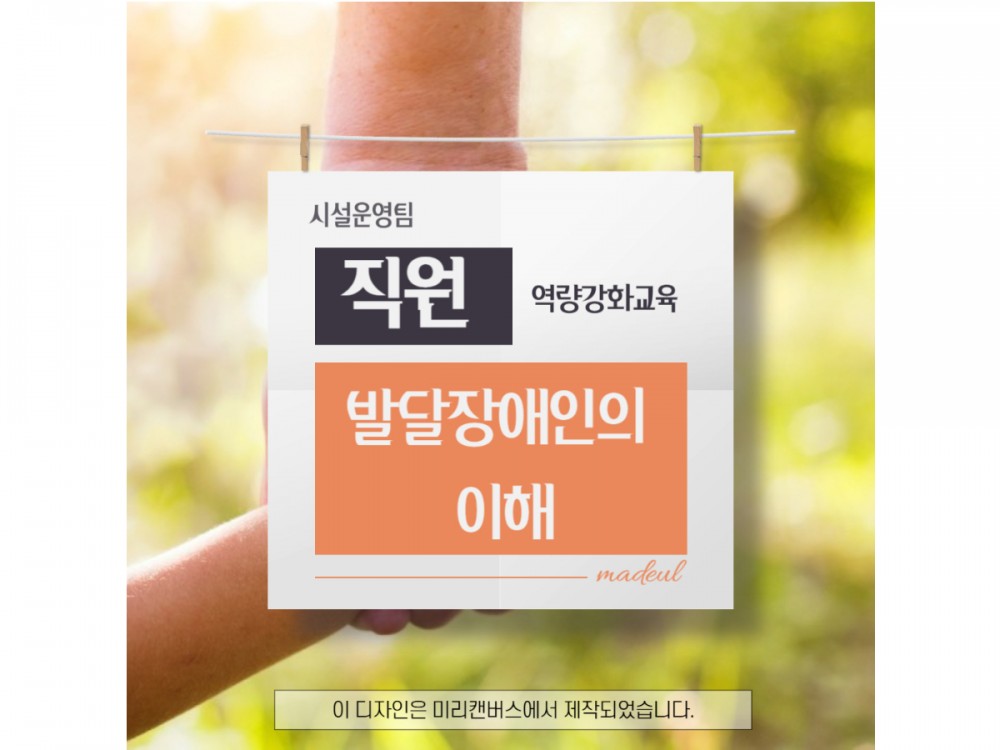 6월 발달장애인의 이해 교육 페이지 정보 작성자 시설운영팀 작성일25-06-08 23:05 조회1,049회 댓글0건 관련링크 이전글 다음글 목록 본문 * 이 디자인은 미리캔버스에서 작업되었습니다.(https://www.miricanvas.com)* 글꼴 출처 : https://bit.ly/4aRZ60P 댓글목록 등록된 댓글이 없습니다. 이전글 다음글 목록