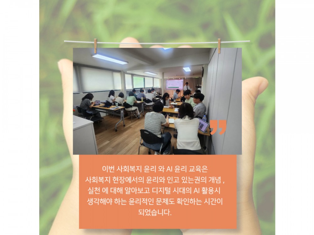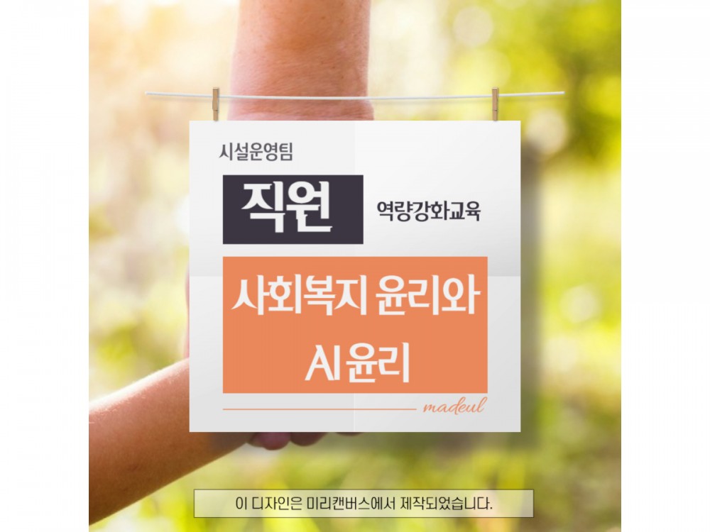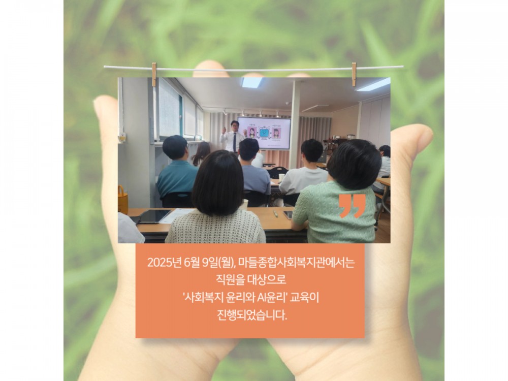 6월 사회복지 윤리와 AI윤리 교육 페이지 정보 작성자 시설운영팀 작성일25-06-13 01:14 조회1,105회 댓글0건 관련링크 이전글 다음글 목록 본문 * 이 디자인은 미리캔버스에서 작업되었습니다.(https://www.miricanvas.com)* 글꼴 출처 : https://bit.ly/4aRZ60P 댓글목록 등록된 댓글이 없습니다. 이전글 다음글 목록