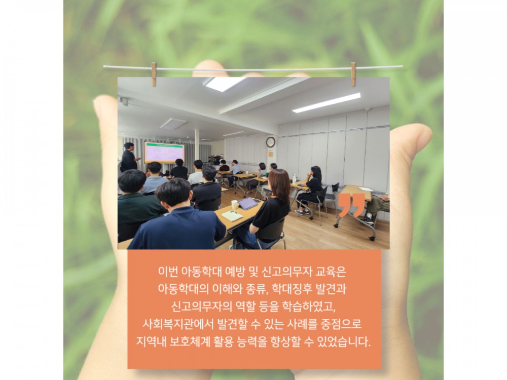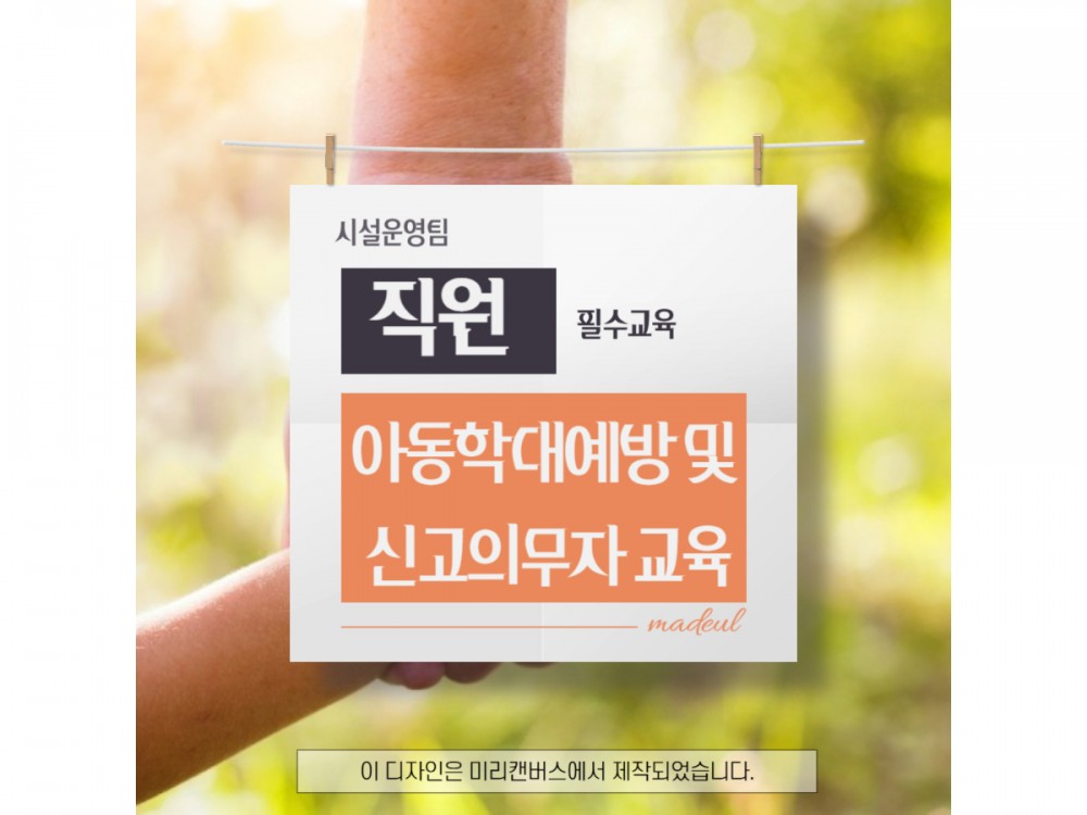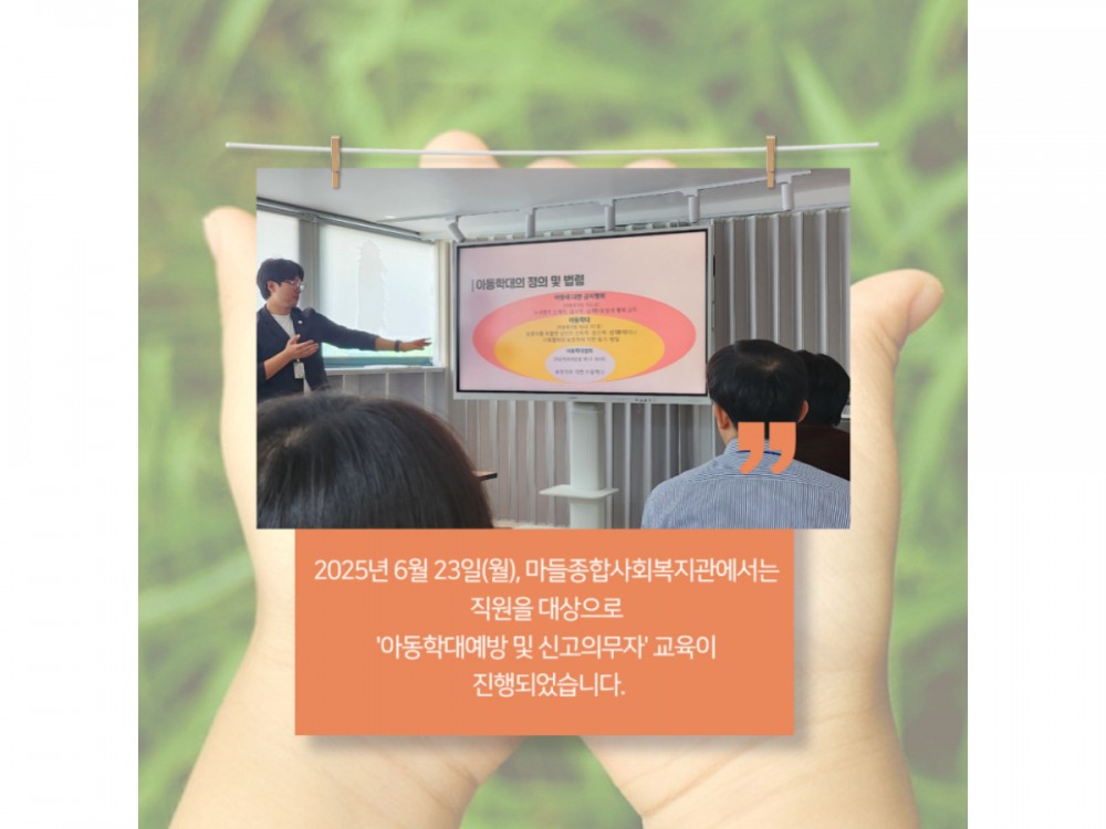 6월 아동학대예방 및 신고의무자 교육 페이지 정보 작성자 시설운영팀 작성일25-06-24 14:14 조회973회 댓글0건 관련링크 이전글 다음글 목록 본문 * 이 디자인은 미리캔버스에서 작업되었습니다.(https://www.miricanvas.com)* 글꼴 출처 : https://bit.ly/4aRZ60P 댓글목록 등록된 댓글이 없습니다. 이전글 다음글 목록