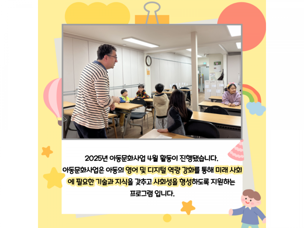 4월 아동문화사업 활동내용 페이지 정보 작성자 사례지원팀 작성일25-04-30 12:20 조회1,107회 댓글0건 관련링크 이전글 다음글 목록 본문 * 이 디자인은 미리캔버스에서 작업되었습니다.(https://www.miricanvas.com)* 글꼴 출처 : https://bit.ly/4aRZ60P#어린이날 #어버이날 #가정의달 댓글목록 등록된 댓글이 없습니다. 이전글 다음글 목록