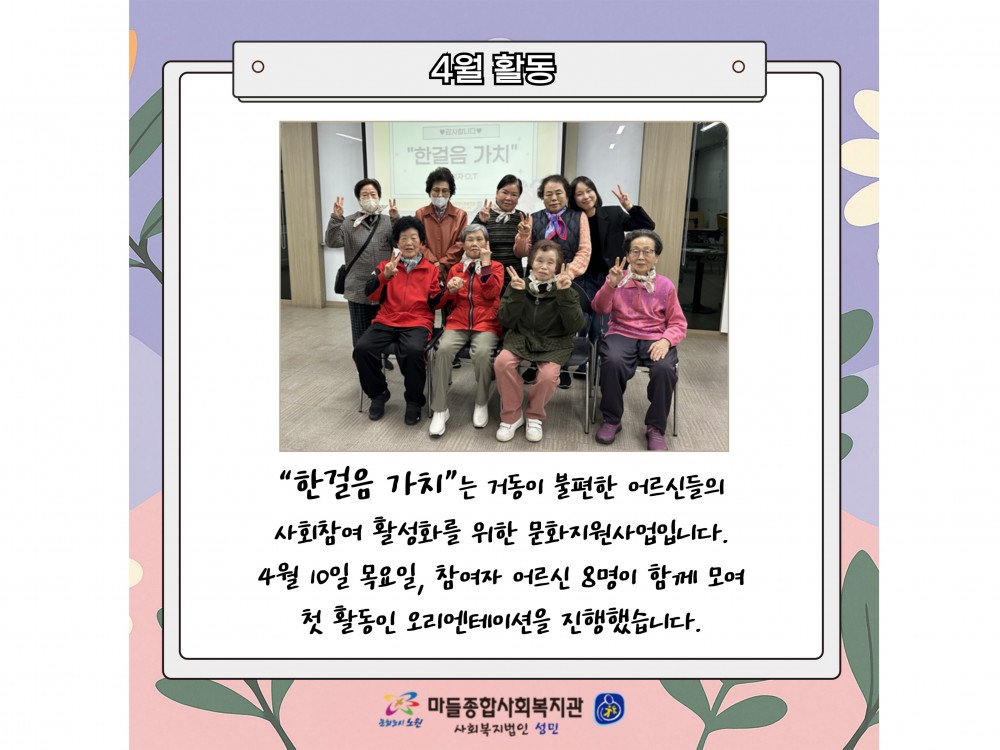 거동불편어르신 문화지원사업 '한걸음가치' 4월 활동 페이지 정보 작성자 서비스1팀 작성일25-04-30 18:39 조회1,135회 댓글0건 관련링크 이전글 다음글 목록 본문 #어린이날 #어버이날 #가정의달* 이 디자인은 미리캔버스에서 작업되었습니다.(https://www.miricanvas.com)* 글꼴 출처 : https://bit.ly/4aRZ60P 댓글목록 등록된 댓글이 없습니다. 이전글 다음글 목록