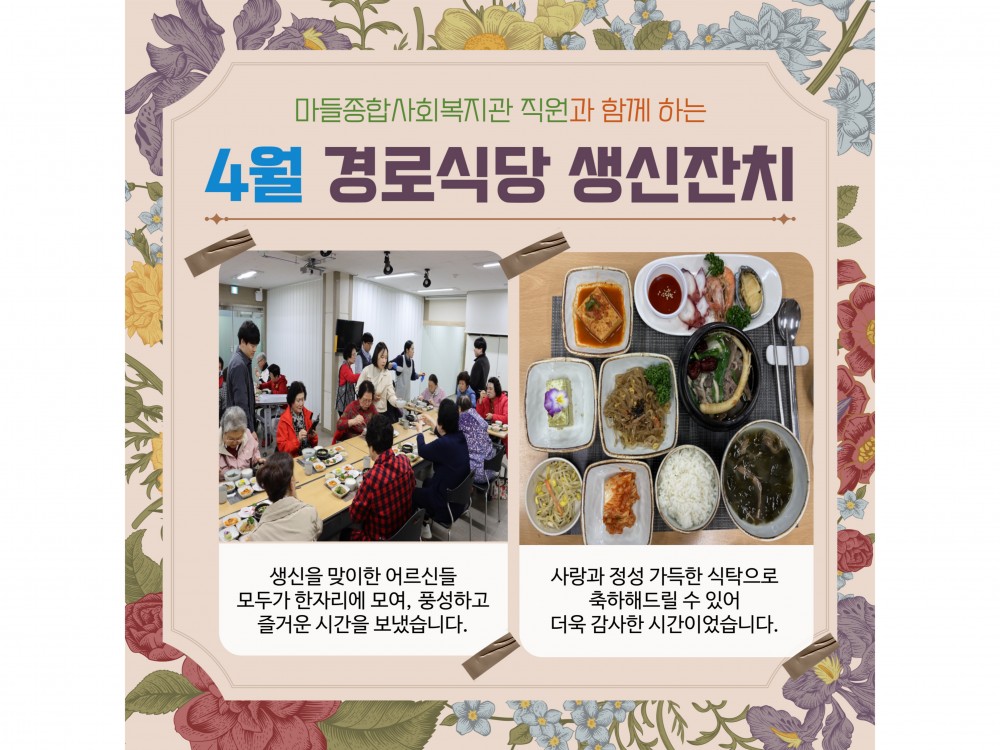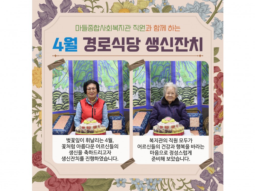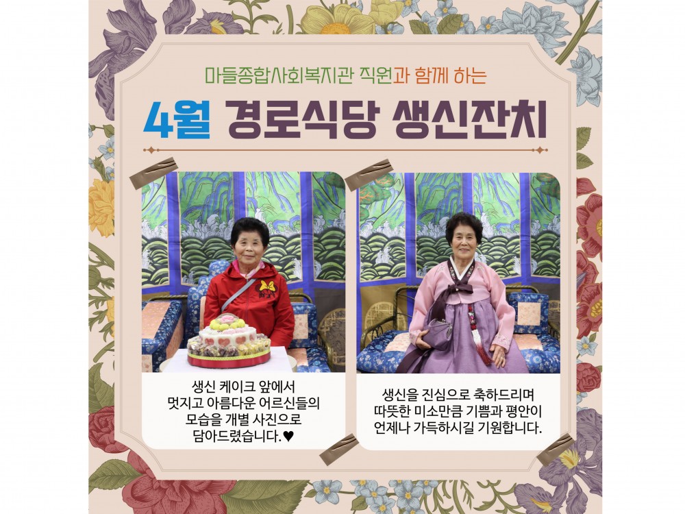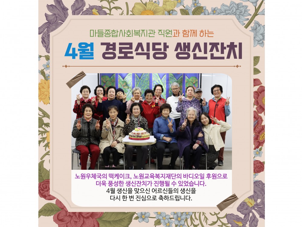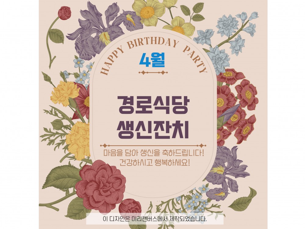4월 경로식당 생신잔치 "함께라서 더 행복한 생일" 페이지 정보 작성자 서비스1팀 작성일25-04-19 11:31 조회1,280회 댓글0건 관련링크 이전글 다음글 목록 본문 #봄 #벚꽃* 이 디자인은 미리캔버스에서 작업되었습니다.(https://www.miricanvas.com)* 글꼴 출처 : https://bit.ly/4aRZ60P 댓글목록 등록된 댓글이 없습니다. 이전글 다음글 목록