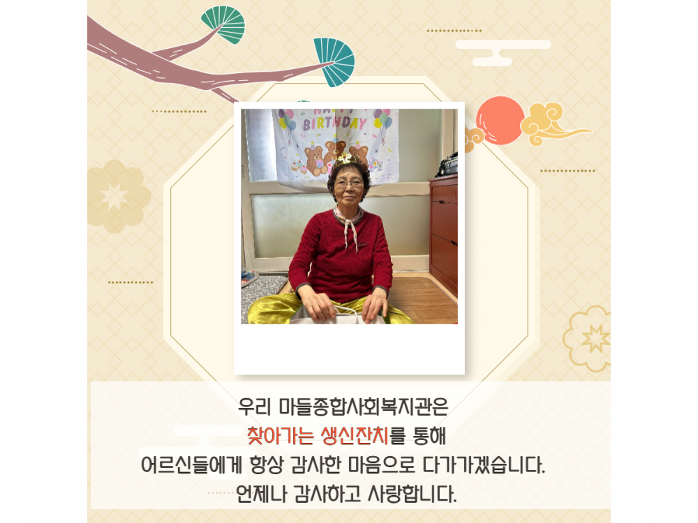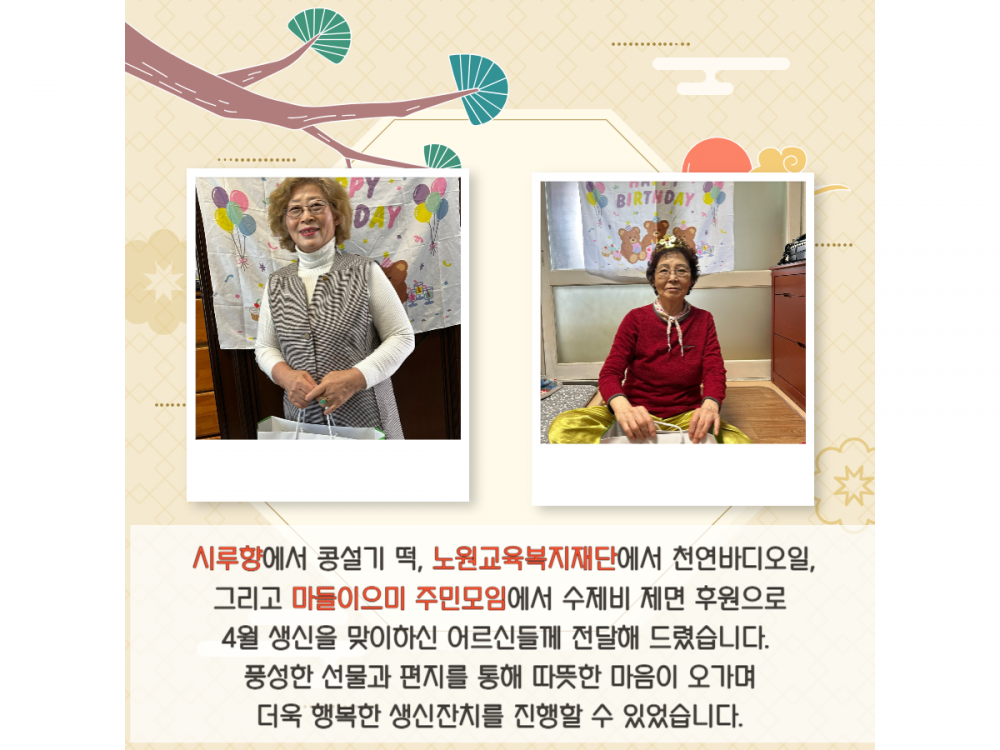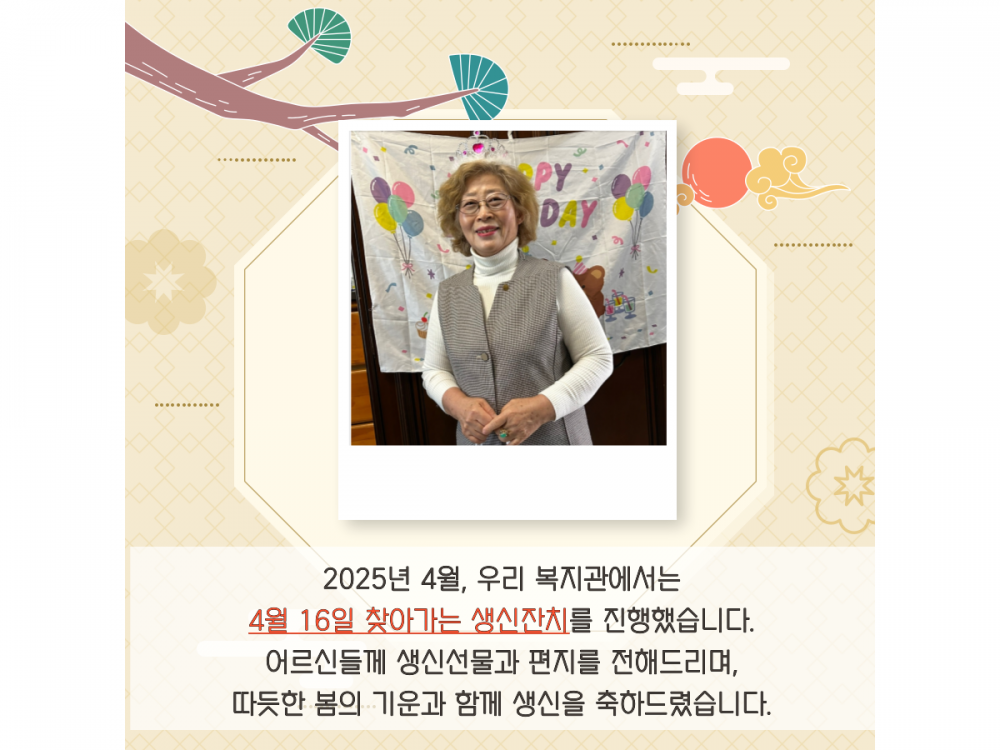 4월 '찾아가는 생신잔치' 페이지 정보 작성자 서비스1팀 작성일25-04-24 13:49 조회1,194회 댓글0건 관련링크 이전글 다음글 목록 본문 #어린이날 #어버이날#가정의달* 이 디자인은 미리캔버스에서 작업되었습니다.(https://www.miricanvas.com)* 글꼴 출처 : https://bit.ly/4aRZ60P 댓글목록 등록된 댓글이 없습니다. 이전글 다음글 목록