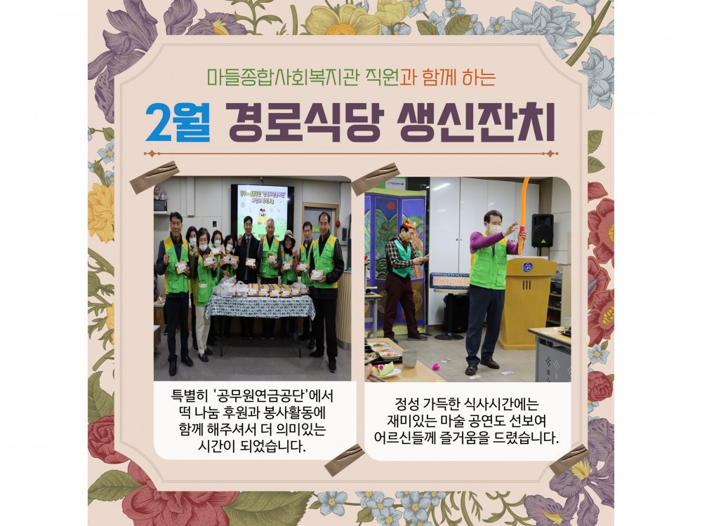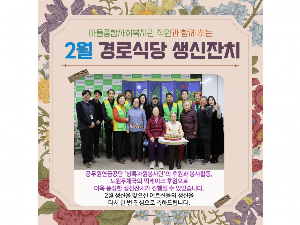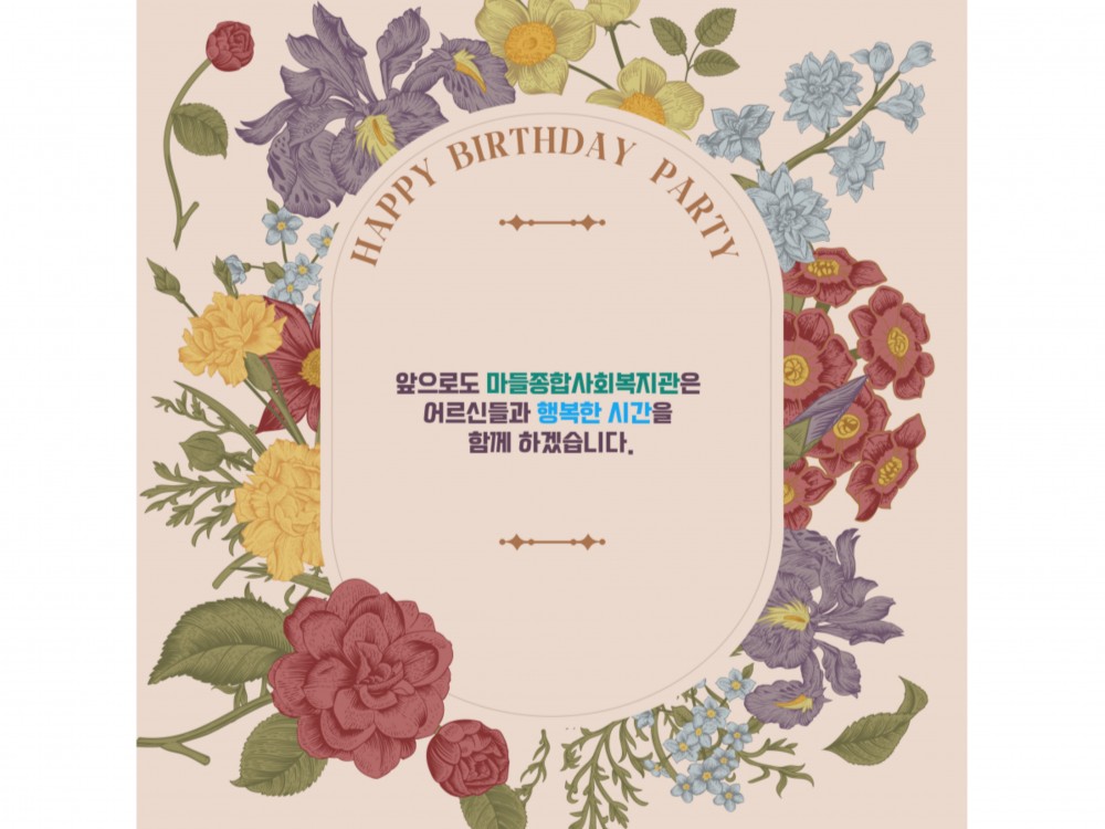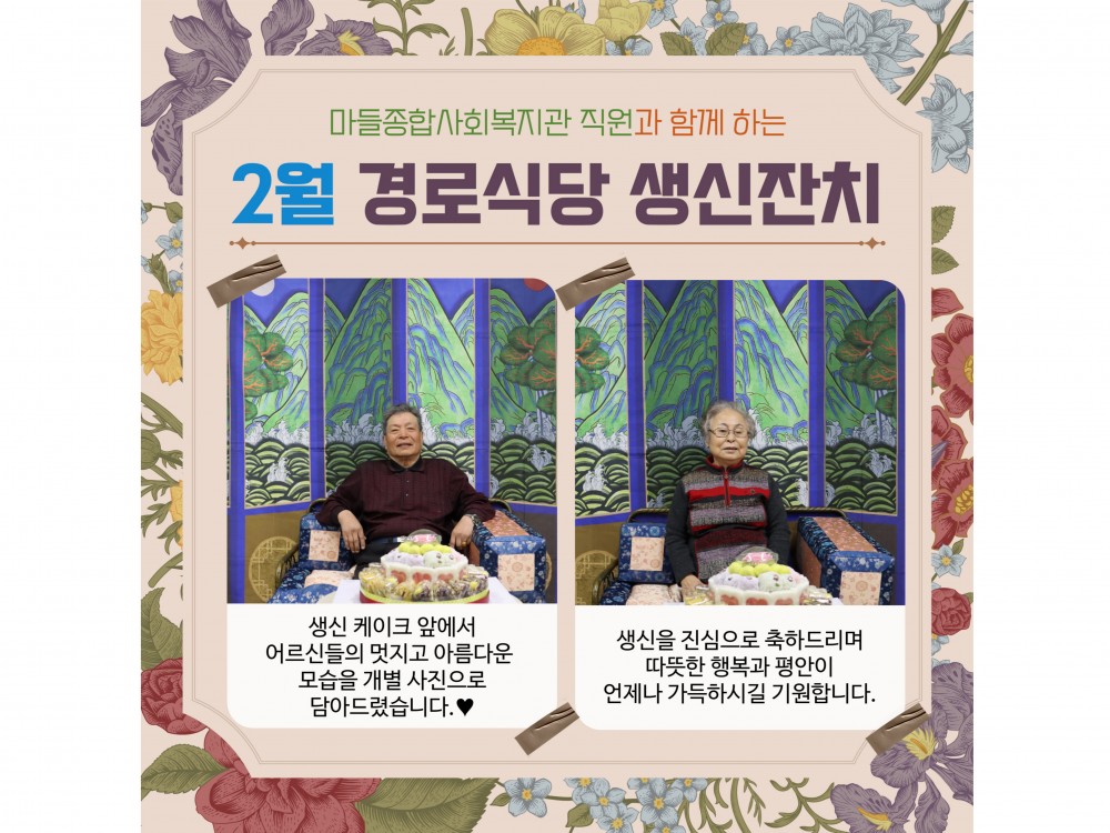 2월 경로식당 생신잔치 "함께라서 더 행복한 생일" 페이지 정보 작성자 서비스1팀 작성일25-03-06 19:04 조회1,321회 댓글0건 관련링크 이전글 다음글 목록 본문 #봄 #벚꽃* 이 디자인은 미리캔버스에서 작업되었습니다.(https://www.miricanvas.com)* 글꼴 출처 : https://bit.ly/4aRZ60P 댓글목록 등록된 댓글이 없습니다. 이전글 다음글 목록
