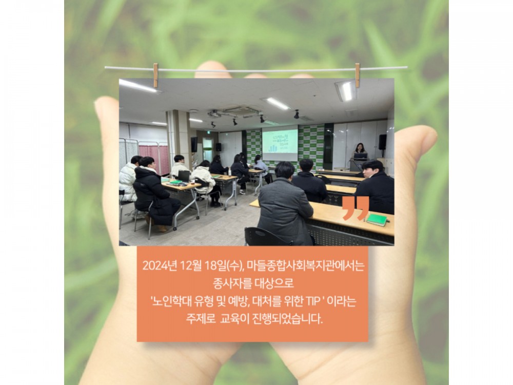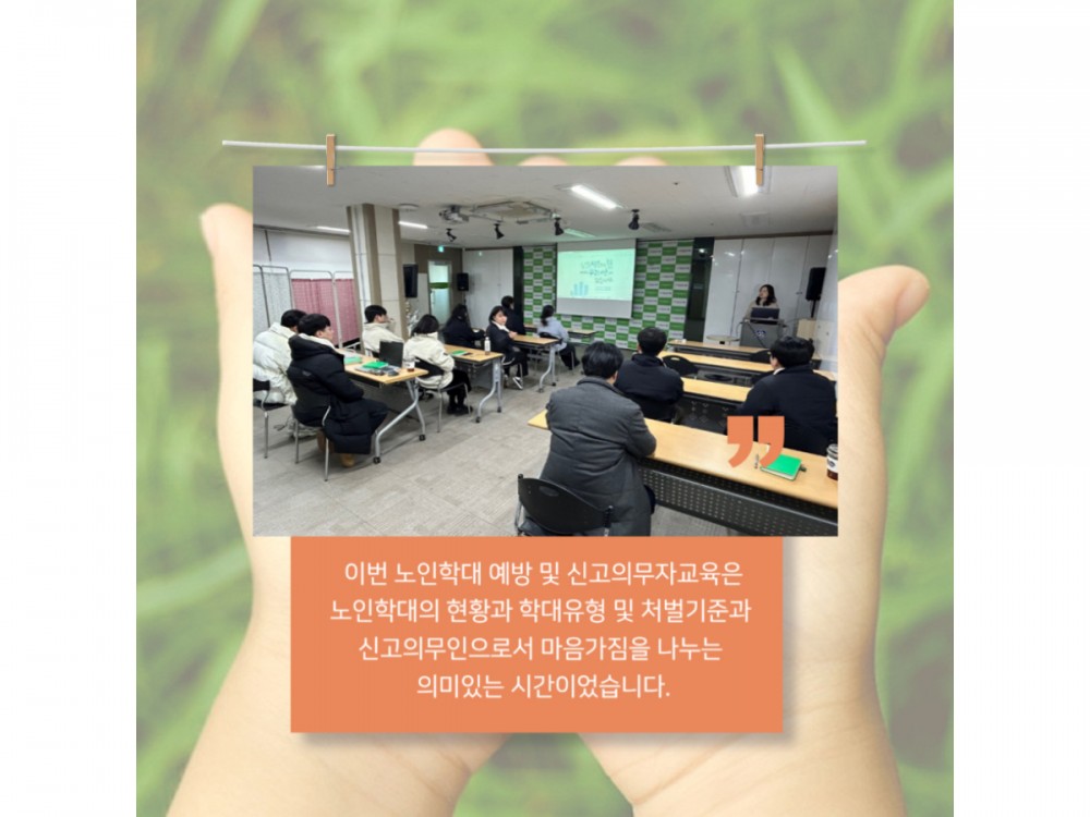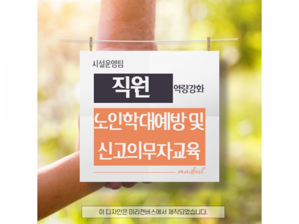 [직원교육] 노인학대예방 및 신고의무자교육 페이지 정보 작성자 시설운영팀 작성일24-12-30 19:52 조회1,517회 댓글0건 관련링크 이전글 다음글 목록 본문 #첫눈 #크리스마스* 이 디자인은 미리캔버스에서 작업되었습니다.(https://www.miricanvas.com)* 글꼴 출처 : https://bit.ly/4aRZ60P 댓글목록 등록된 댓글이 없습니다. 이전글 다음글 목록