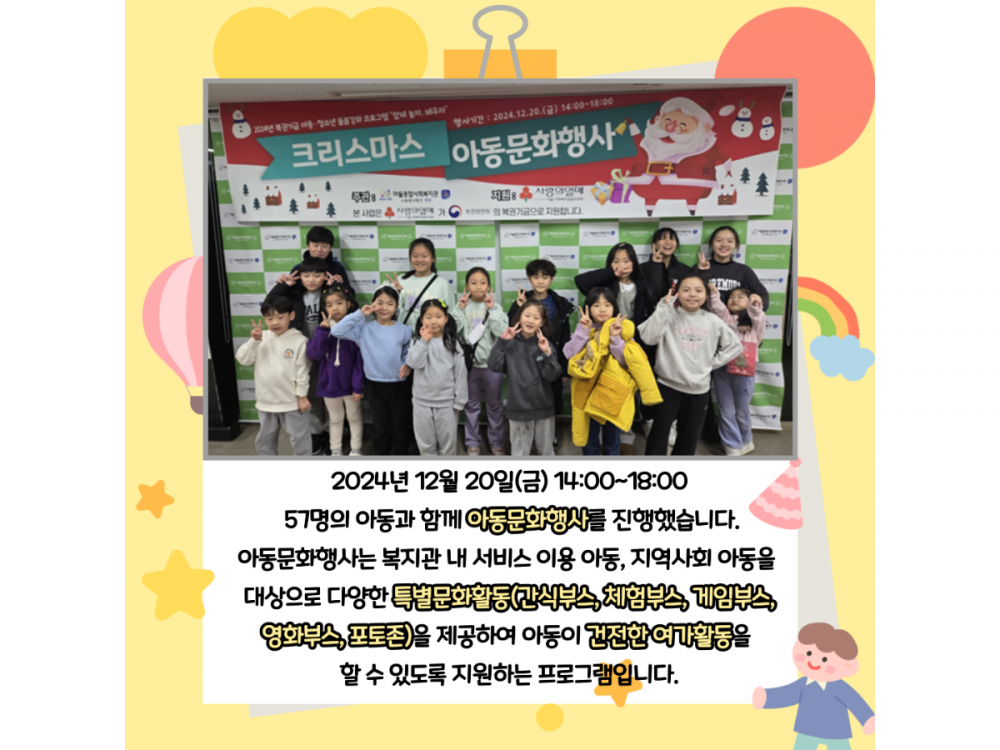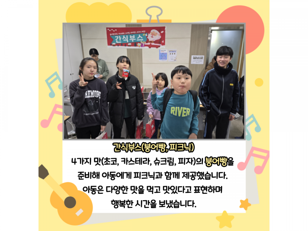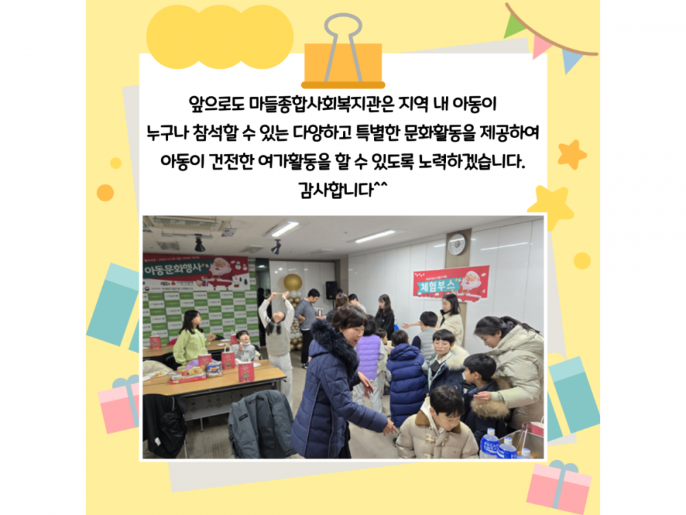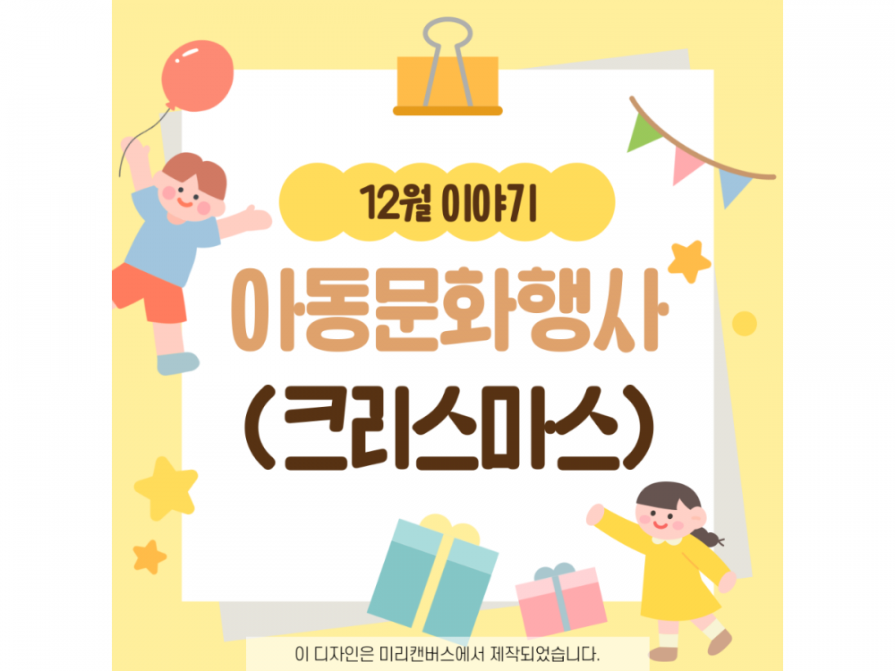 12월 아동문화행사(크리스마스) 페이지 정보 작성자 서비스1팀 작성일24-12-31 14:06 조회1,496회 댓글0건 관련링크 이전글 다음글 목록 본문 #첫눈 #크리스마스* 이 디자인은 미리캔버스에서 작업되었습니다.(https://www.miricanvas.com)* 글꼴 출처 : https://bit.ly/4aRZ60P 댓글목록 등록된 댓글이 없습니다. 이전글 다음글 목록