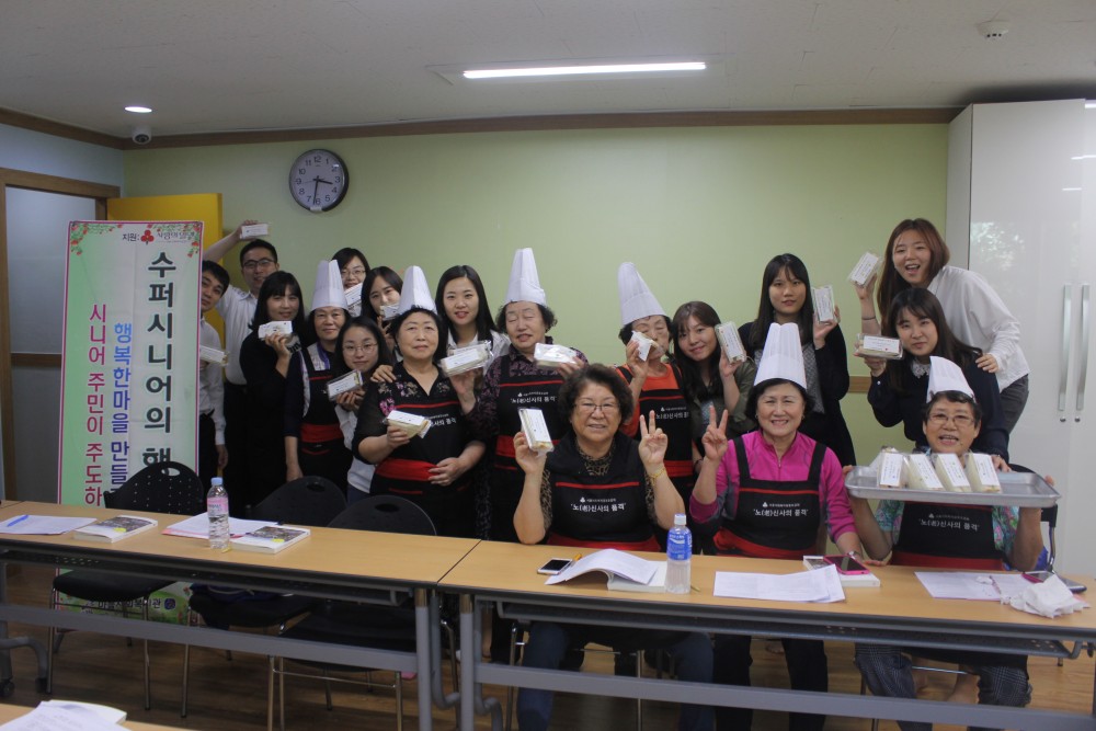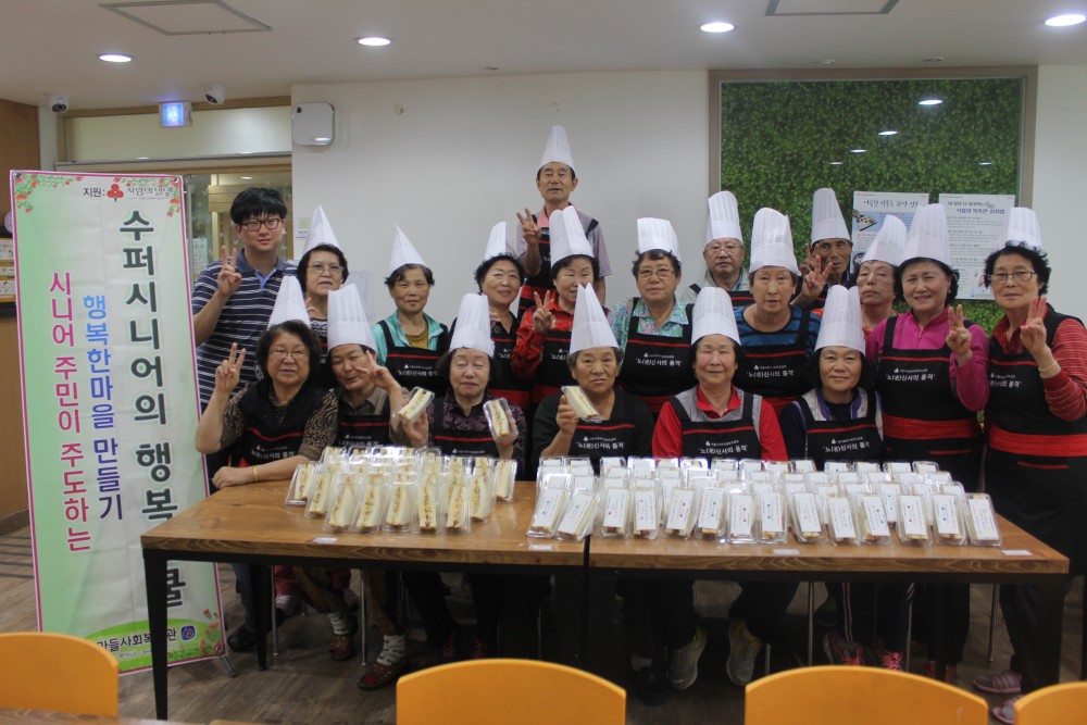 2015년 10월 8일(목) 서울사회복지공동모금회 지원사업 수퍼시니어의 행복스쿨 10월 나눔교실이 진행되었습니다. 시니어 주민들이 복지관, 관리사무소, 경비실, 어린이집 등 지역주민을 위해 일하는 종사자들을 위해 맛있는 샌드위치를 만들어 나누는 시간이 되었습니다. 함께 사진도 찍고 얼굴도 서로 익히며 즐거운 시간을 보내었습니다.