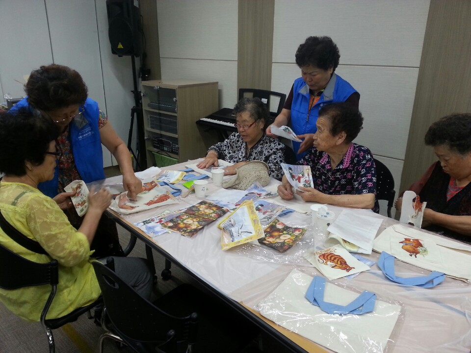 이번 활동은 수퍼시니어의 행복스쿨 어르신들과 함께 냅킨아트로 가방 꾸미기를 해보았습니다.
