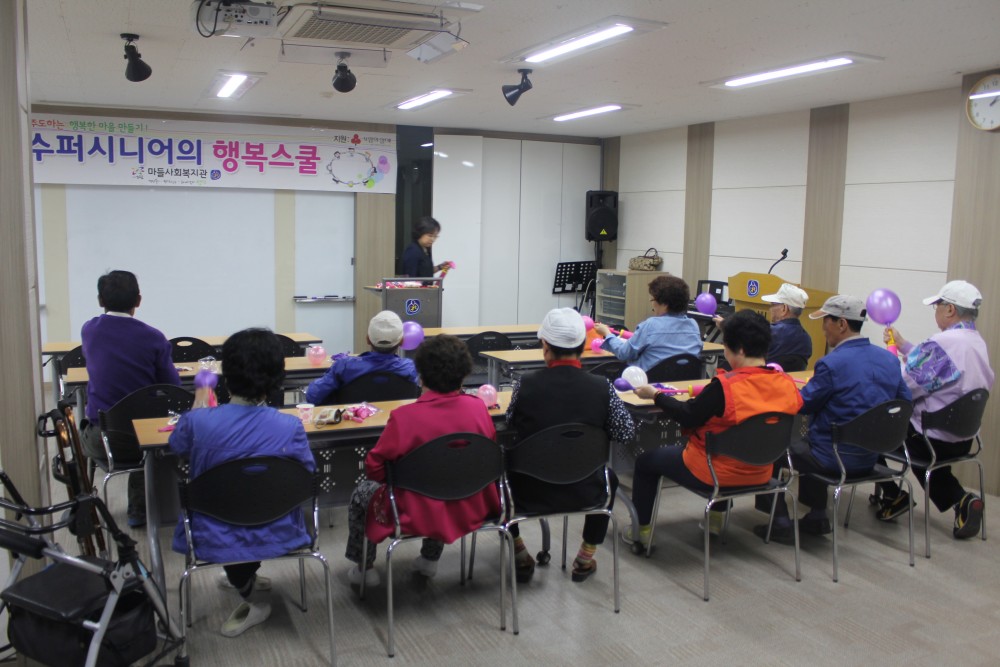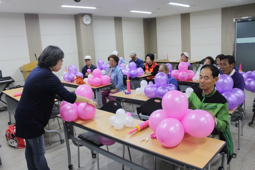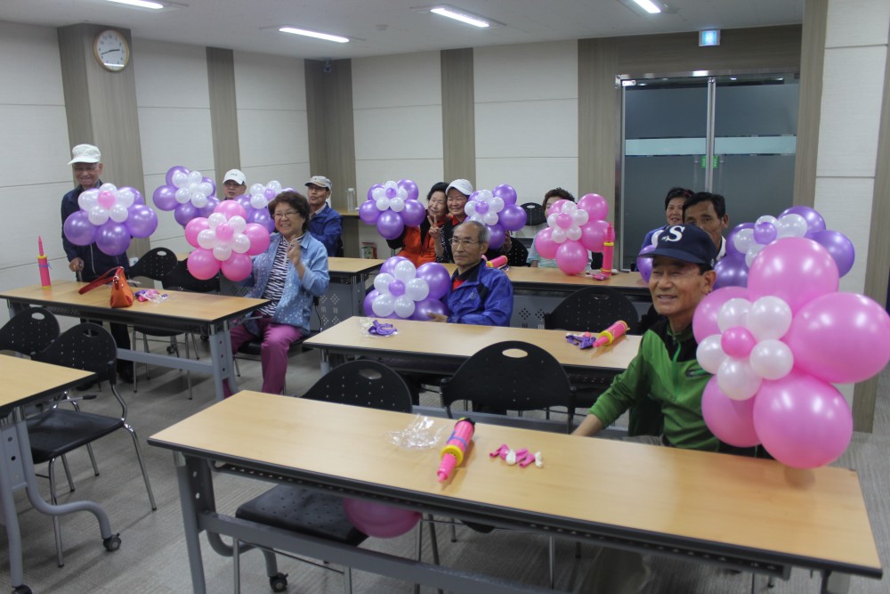 2015년 5월 12일(화) 복지관 2층 강당에서는 서울사회복지공동모금회 3차년도 지원사업 ‘수퍼시니어의 행복스쿨’ 문화교실이 진행되었습니다. 5월 문화교실(얼씨구~전통문화 세대공감)의 주제는 풍선 기본위법을 배우고 만든 것을 아이들에게 나누어 주는 시간을 가졌습니다. “힘들긴 하지만 완성된 것을 보니 더 어려운 것도 배워보고 싶다.”, “다음 활동이 기대된다.”며 즐겁게 활동하였습니다. 점점 다양한 활동에 대한 경험이 축적되어지는 수퍼시니어의 활동에 많은 관심과 응원 부탁드립니다.