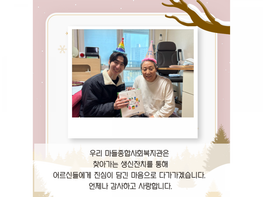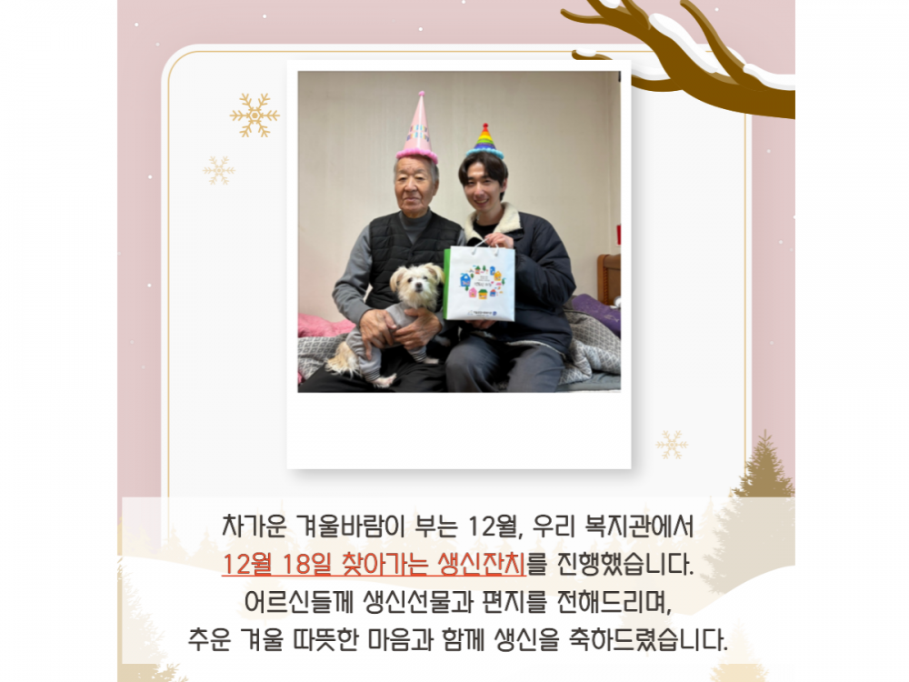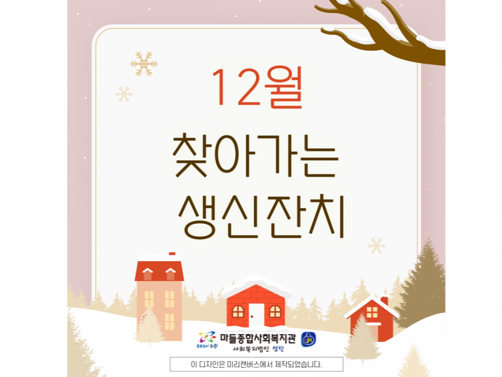 12월 '찾아가는 생신잔치' 페이지 정보 작성자 서비스1팀 작성일24-12-27 17:38 조회1,489회 댓글0건 관련링크 이전글 다음글 목록 본문 #첫눈 #크리스마스* 이 디자인은 미리캔버스에서 작업되었습니다.(https://www.miricanvas.com)* 글꼴 출처 : https://bit.ly/4aRZ60P 댓글목록 등록된 댓글이 없습니다. 이전글 다음글 목록