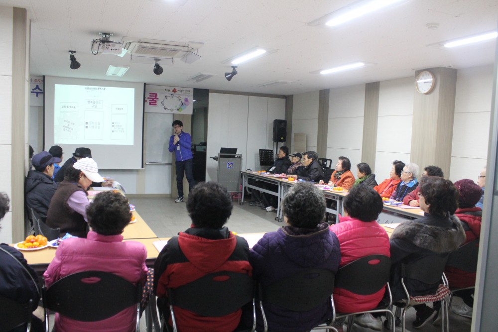 개강식을 통해 2차년도 '꽃노인의 문화도전'에 이어 3차년도 '수퍼시니어의 행복스쿨'로 변경된 프로그램 세부내용 및 일정에 대해 안내드리고 자기소개 및 2015년 회장과 총무를 선출하는 시간을 가졌습니다.