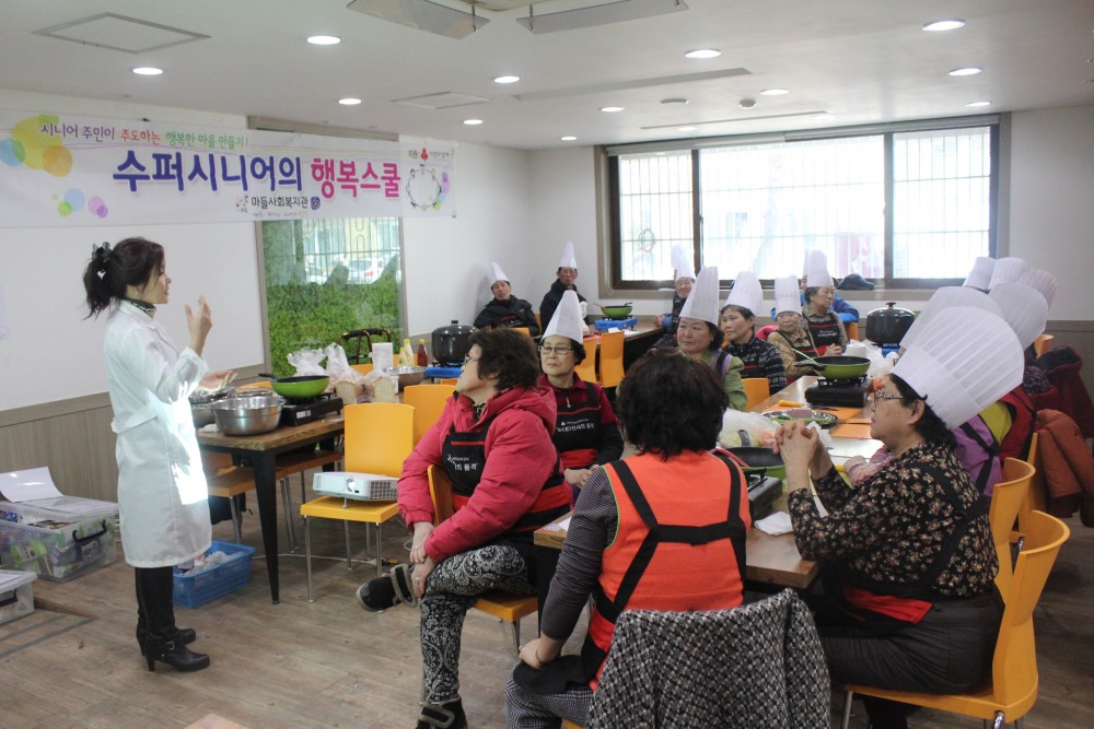 2015년 3월 12일(목) 복지관 1층 미소레스토랑에서는 서울사회복지공동모금회 3차년도 지원사업 시니어 주민이 주도하는 행복한 마을 공동체 만들기 ‘수퍼시니어의 행복스쿨’ 나눔교실이 진행되었습니다.