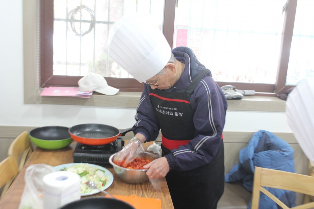 9회기는 특식도시락: 제육고추장불고기, 양배추 깻잎겉절이를 만들어 보았습니다. 빨간 겉절이를 생각했던 모두의 예상을 깨고 간장과 식초를 주 양념으로 한 새콤달콤한 겉절이를 만들어 보았습니다. 언제먹어도 맛있는 불고기와 새로운 경험이었던 양배추 깻잎겉절이를 만들면서 어르신들은 “너무 맛있다.”,“겉절이가 정말 놀랍다. 레시피를 꼭 가지고 가야겠다.”며 즐겁게 요리를 하였습니다.