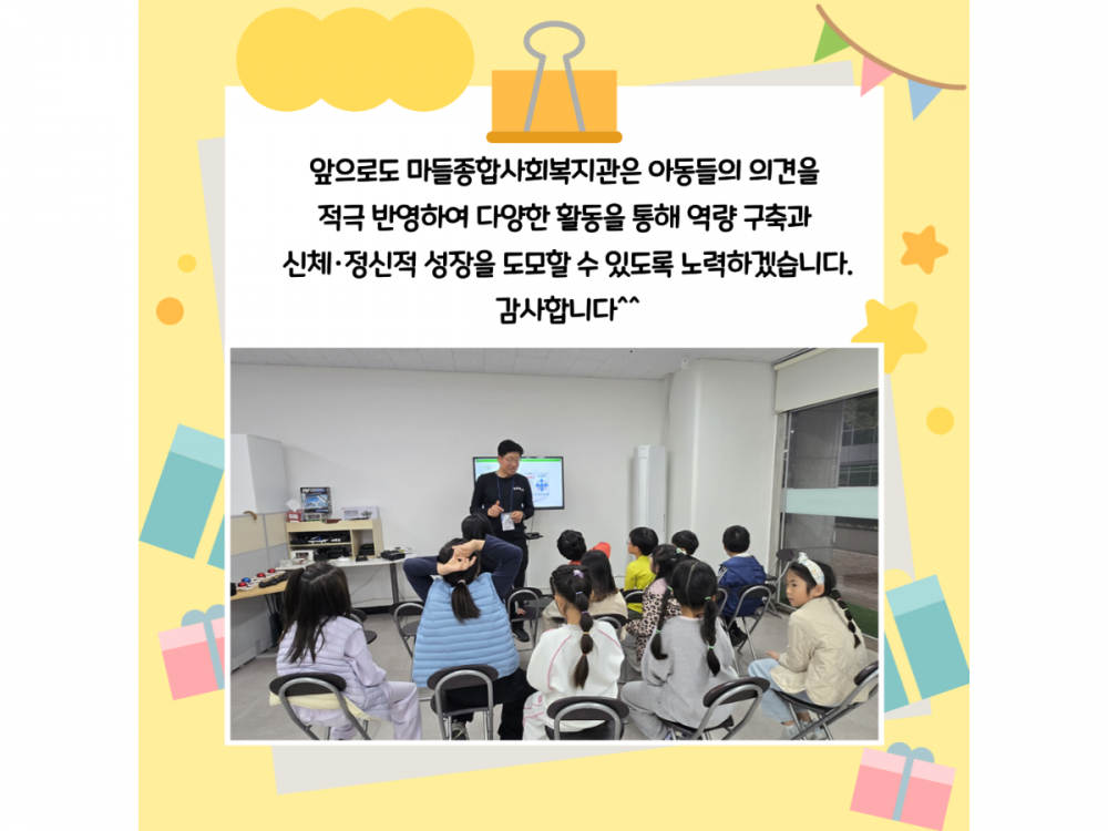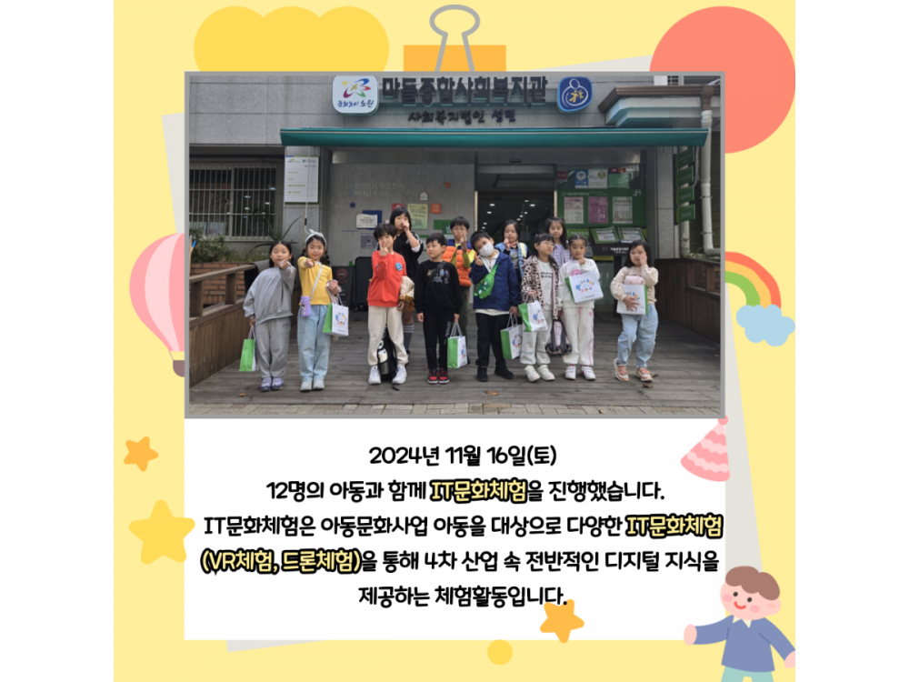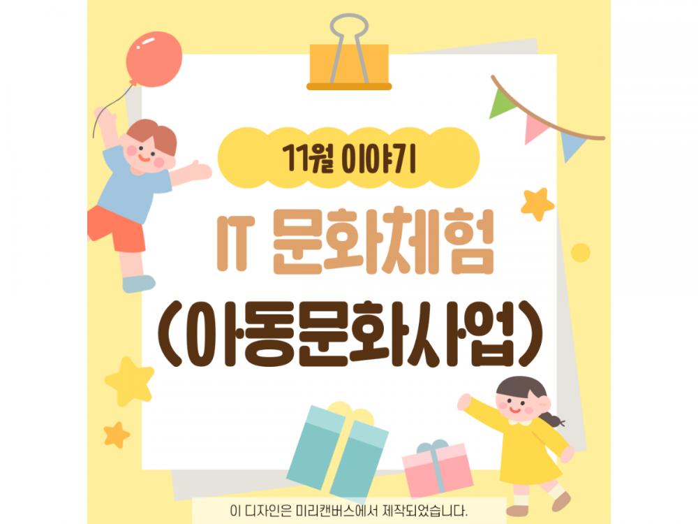 11월 IT문화체험(아동문화사업) 활동내용 페이지 정보 작성자 서비스1팀 작성일24-11-29 17:08 조회1,552회 댓글0건 관련링크 이전글 다음글 목록 본문 * 이 디자인은 미리캔버스에서 작업되었습니다.(https://www.miricanvas.com)* 글꼴 출처 : https://bit.ly/4aRZ60P#크리스마스 #첫눈 댓글목록 등록된 댓글이 없습니다. 이전글 다음글 목록