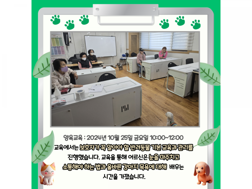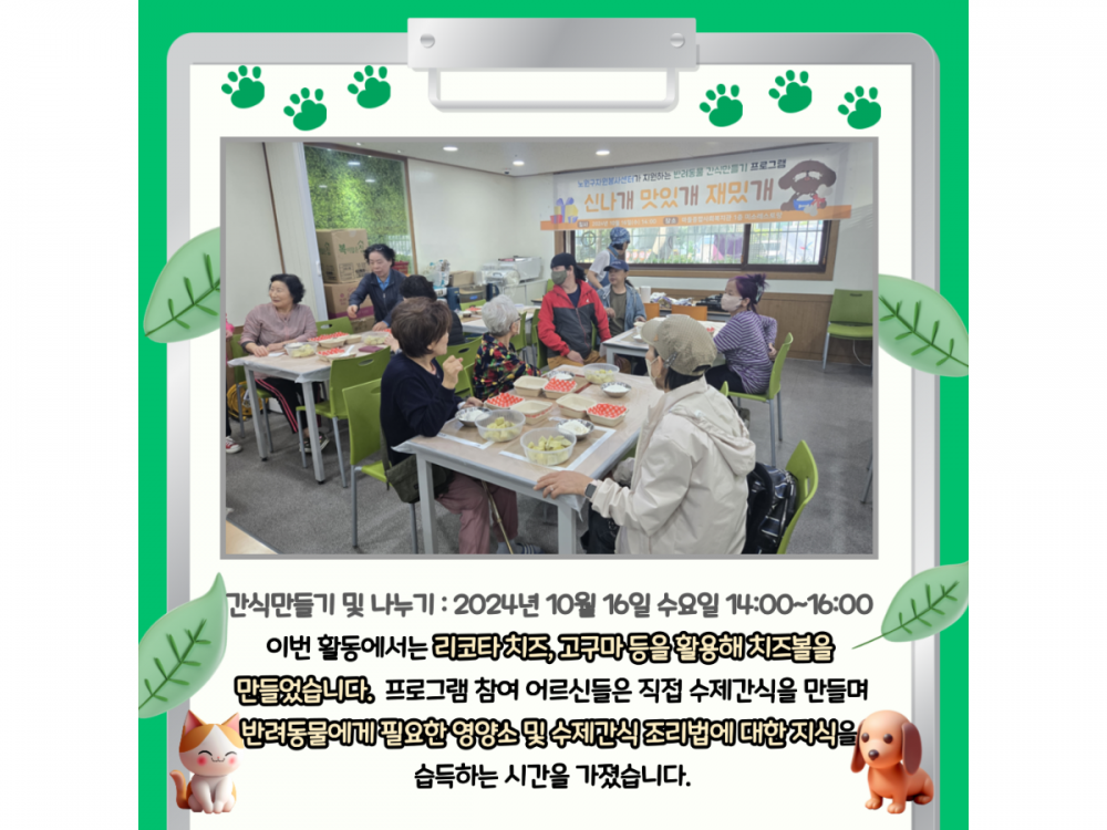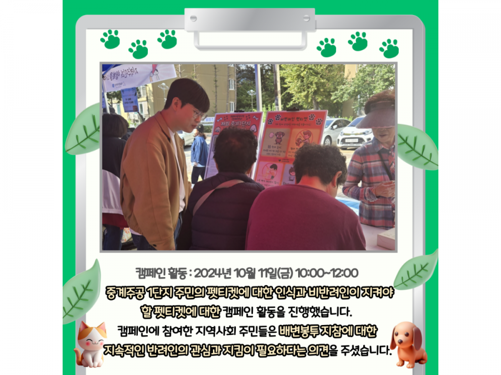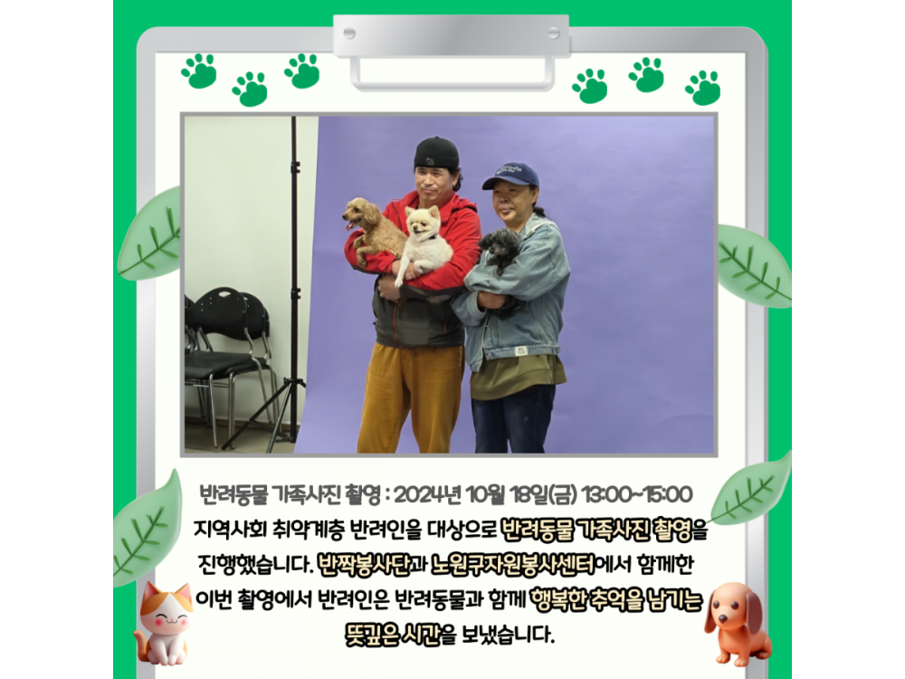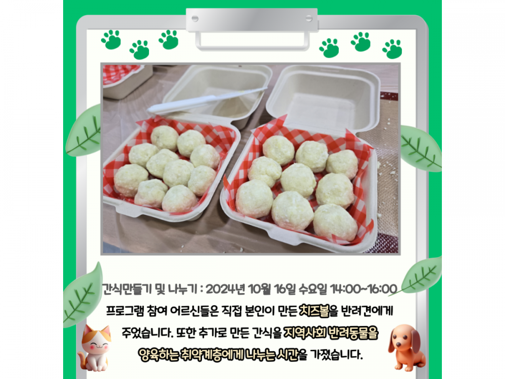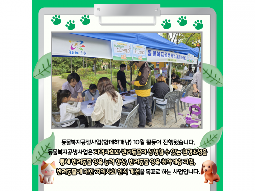 10월 동물복지공생사업(함께하개냥) 활동내용 페이지 정보 작성자 서비스1팀 작성일24-10-30 19:59 조회1,679회 댓글0건 관련링크 이전글 다음글 목록 본문 #추석#단풍#송편* 이 디자인은 미리캔버스에서 작업되었습니다.(https://www.miricanvas.com)* 글꼴 출처 : https://bit.ly/4aRZ60P 댓글목록 등록된 댓글이 없습니다. 이전글 다음글 목록