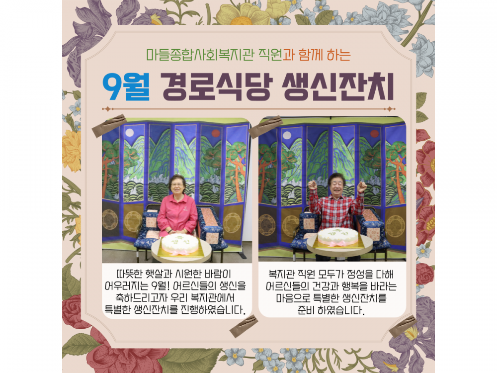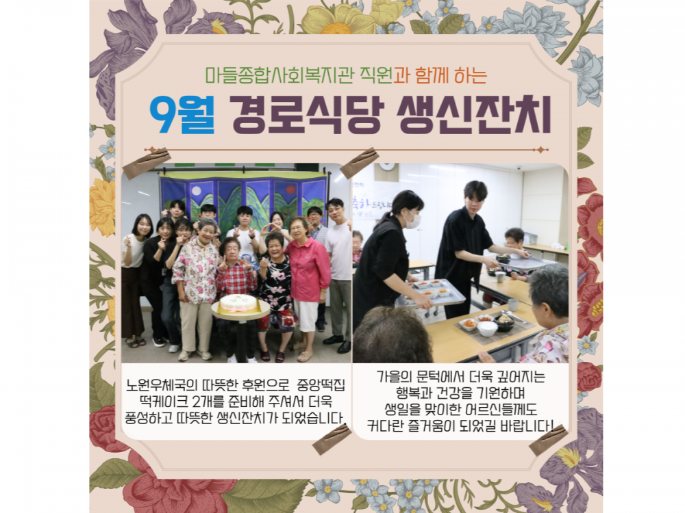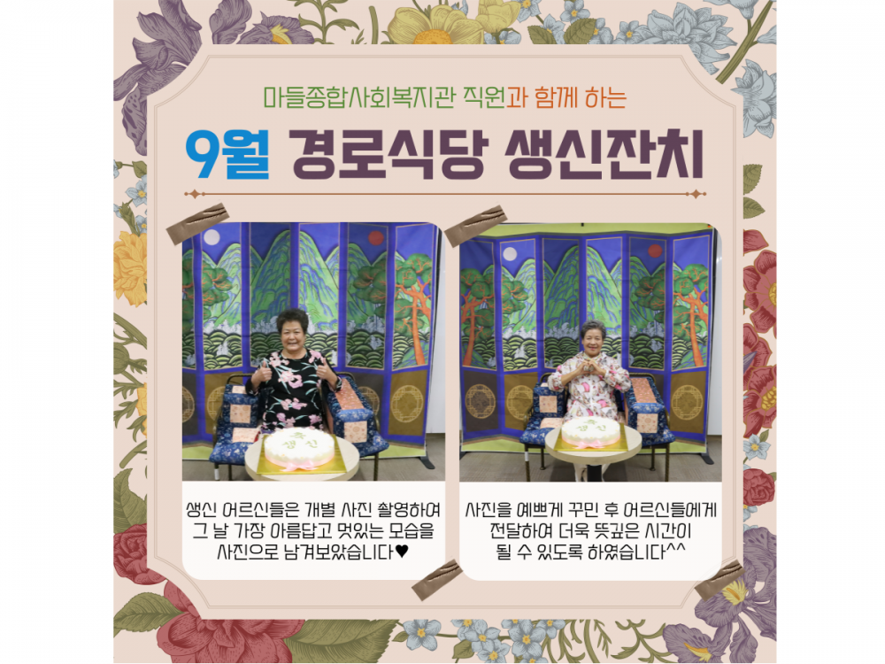 9월 경로식당 생신잔치 "함께라서 더 행복한 생일" 페이지 정보 작성자 서비스1팀 작성일24-09-25 17:17 조회1,865회 댓글0건 관련링크 이전글 다음글 목록 본문 #추석 #단풍 #송편* 이 디자인은 미리캔버스에서 작업되었습니다.(https://www.miricanvas.com)* 글꼴 출처 : https://bit.ly/4aRZ60P 댓글목록 등록된 댓글이 없습니다. 이전글 다음글 목록