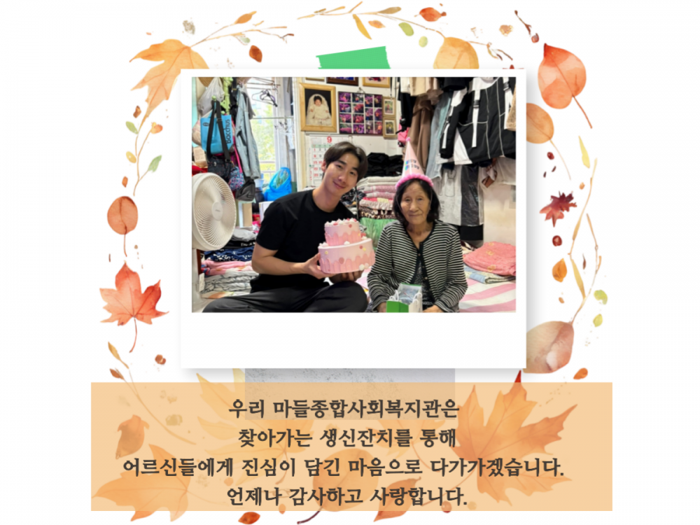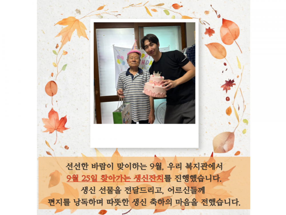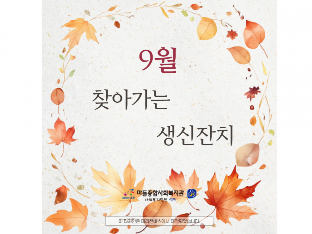 9월 '찾아가는 생신잔치' 페이지 정보 작성자 서비스1팀 작성일24-09-25 18:01 조회1,774회 댓글0건 관련링크 이전글 다음글 목록 본문 #추석#단풍#송편* 이 디자인은 미리캔버스에서 작업되었습니다.(https://www.miricanvas.com)* 글꼴 출처 : https://bit.ly/4aRZ60P 댓글목록 등록된 댓글이 없습니다. 이전글 다음글 목록