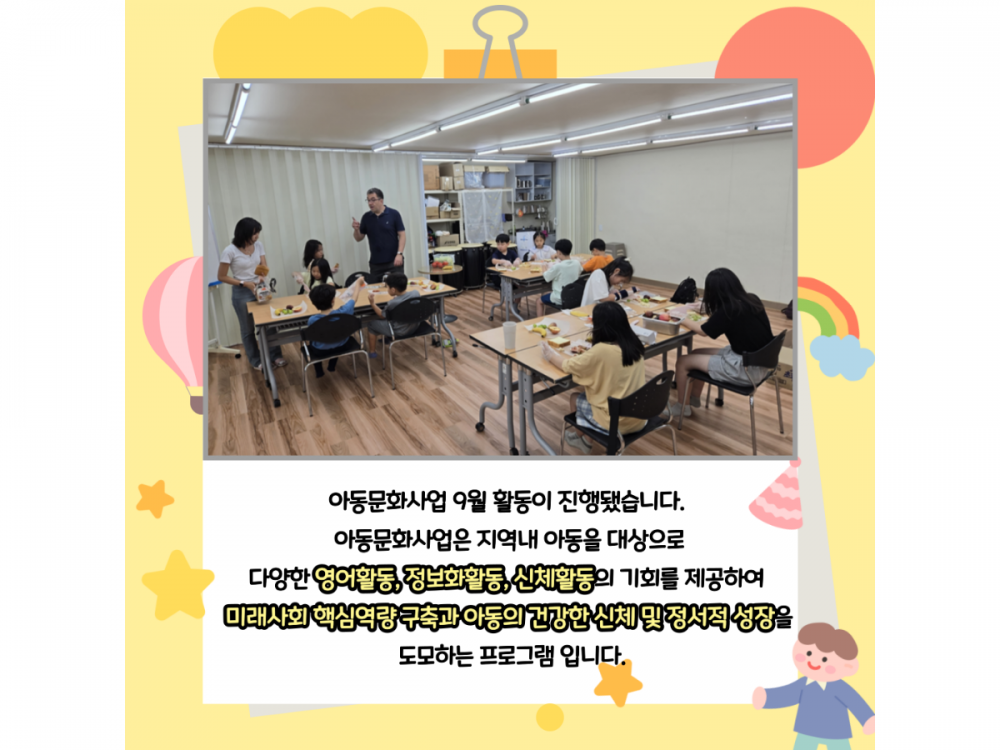 9월 아동문화사업 활동내용 페이지 정보 작성자 서비스1팀 작성일24-09-27 09:19 조회1,891회 댓글0건 관련링크 이전글 다음글 목록 본문 #9월 #추석 #마스크 댓글목록 등록된 댓글이 없습니다. 이전글 다음글 목록