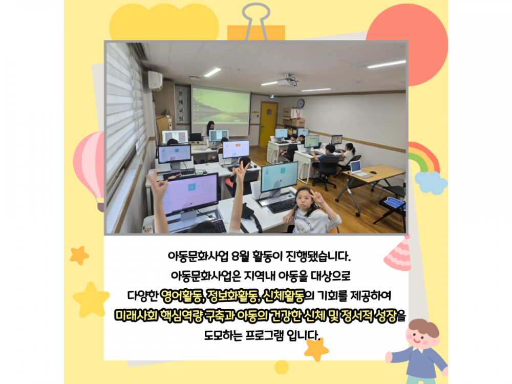 8월 아동문화사업 활동내용 페이지 정보 작성자 서비스1팀 작성일24-08-30 14:45 조회1,785회 댓글0건 관련링크 이전글 다음글 목록 본문 #무더위 #수박 #폭염 댓글목록 등록된 댓글이 없습니다. 이전글 다음글 목록