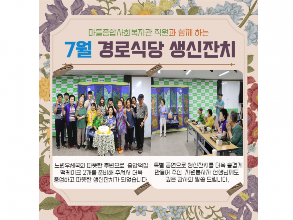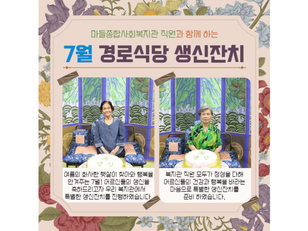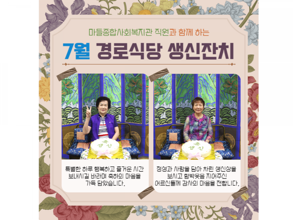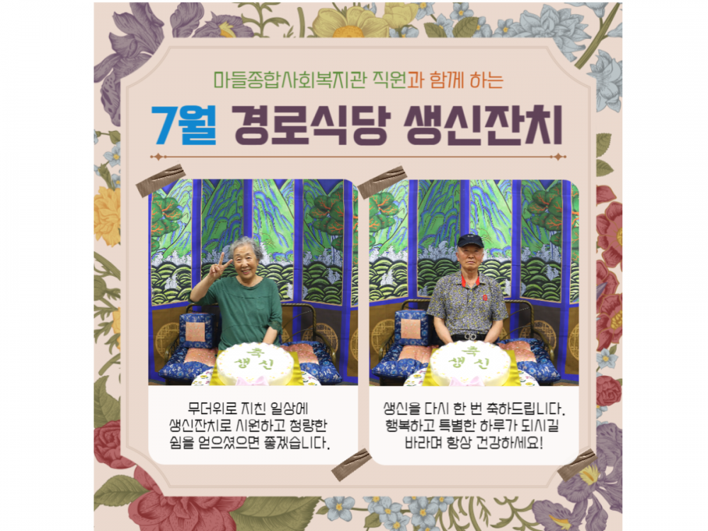 7월 경로식당 생신잔치 "함께라서 더 행복한 생일" 페이지 정보 작성자 서비스1팀 작성일24-07-25 18:10 조회1,912회 댓글0건 관련링크 이전글 다음글 목록 본문 * 이 디자인은 미리캔버스에서 작업되었습니다.(https://www.miricanvas.com)글꼴 출처 : https://bit.ly/4aRZ60P 댓글목록 등록된 댓글이 없습니다. 이전글 다음글 목록
