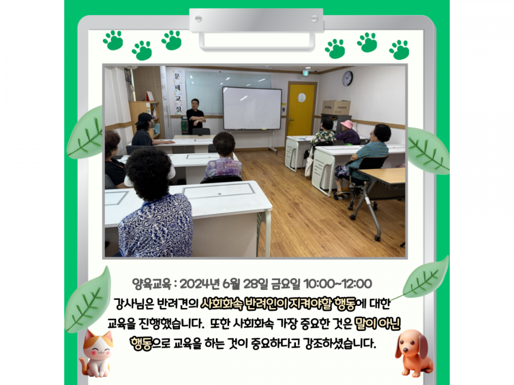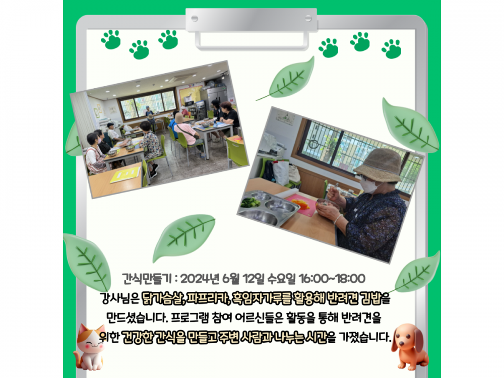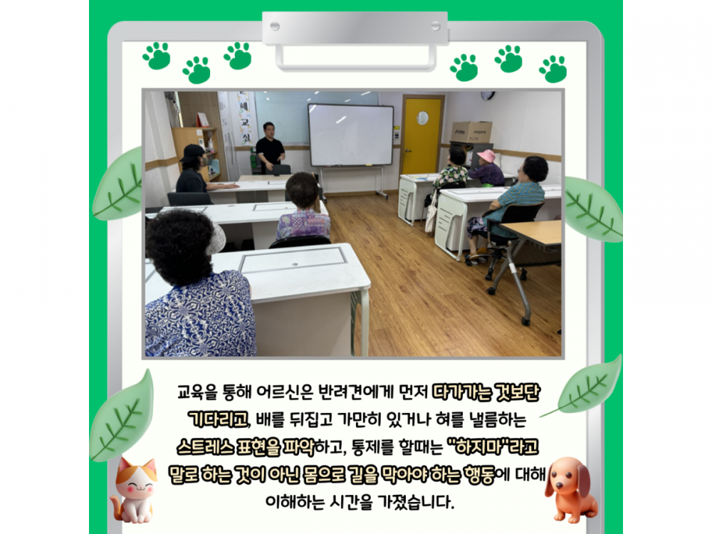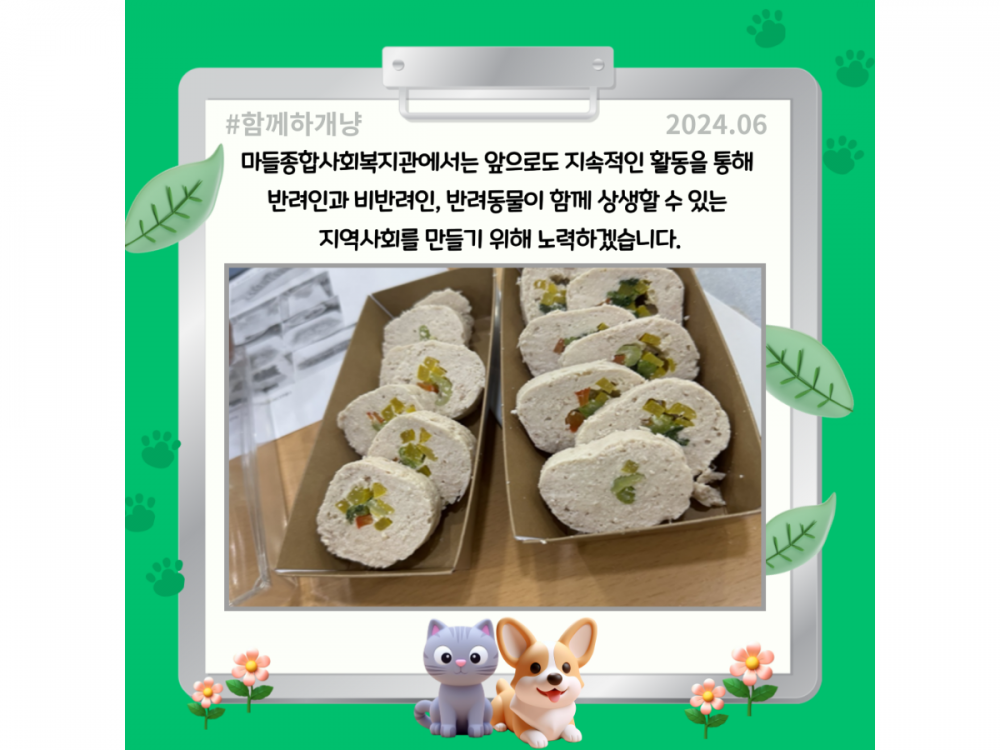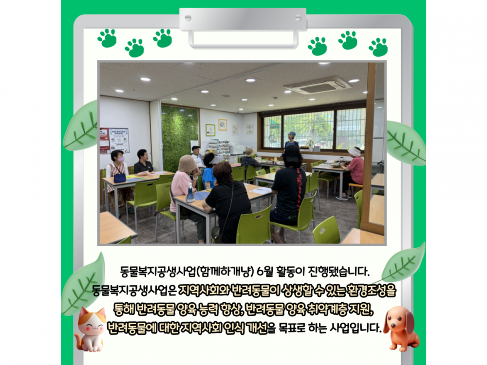 6월 동물복지공생사업(함께하개냥) 활동내용 페이지 정보 작성자 서비스1팀 작성일24-06-28 15:25 조회1,950회 댓글0건 관련링크 이전글 다음글 목록 본문 #물놀이, #폭염* 이 디자인은 미리캔버스에서 작업되었습니다.(https://www.miricanvas.com)* 글꼴 출처 : https://bit.ly/4aRZ60P 댓글목록 등록된 댓글이 없습니다. 이전글 다음글 목록