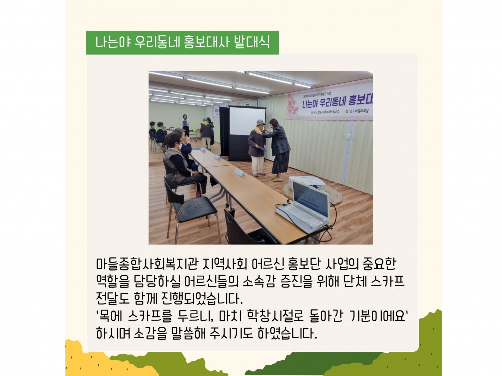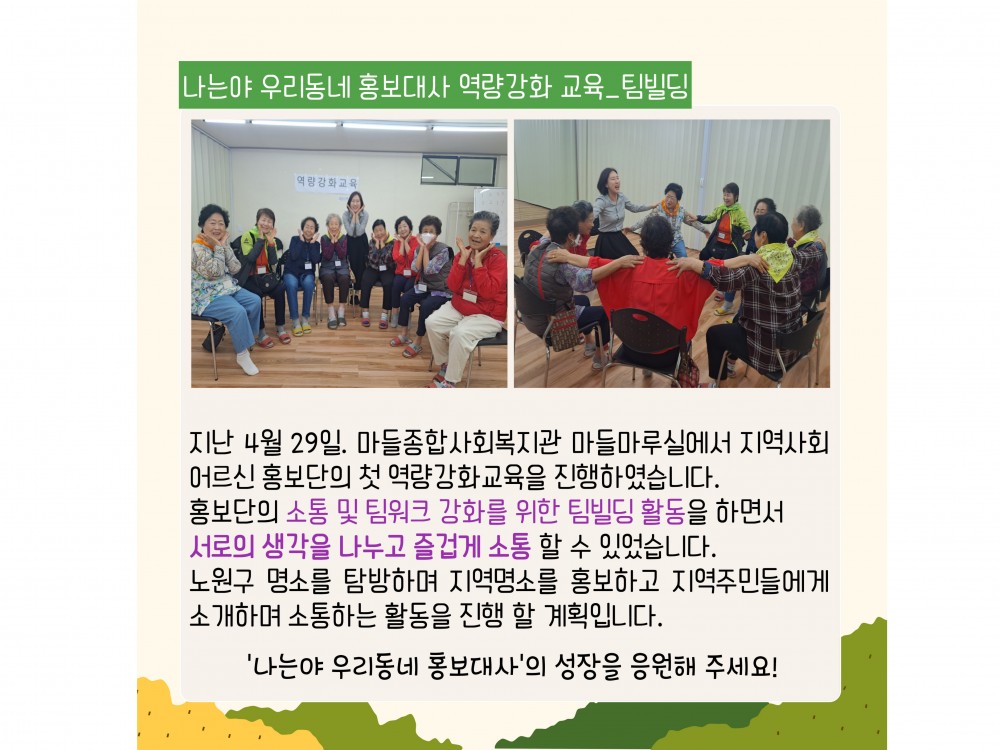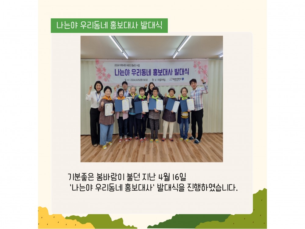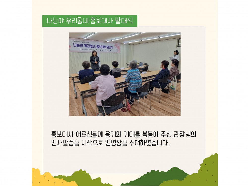 4월 지역사회어르신 홍보단사업 활동내용 페이지 정보 작성자 서비스1팀 작성일24-04-30 16:01 조회2,155회 댓글0건 관련링크 이전글 다음글 목록 본문 * 이 디자인은 미리캔버스에서 작업되었습니다.(https://www.miricanvas.com)* 글꼴 출처 : https://bit.ly/4aRZ60P#벚꽃#어린이날#어버이날 댓글목록 등록된 댓글이 없습니다. 이전글 다음글 목록