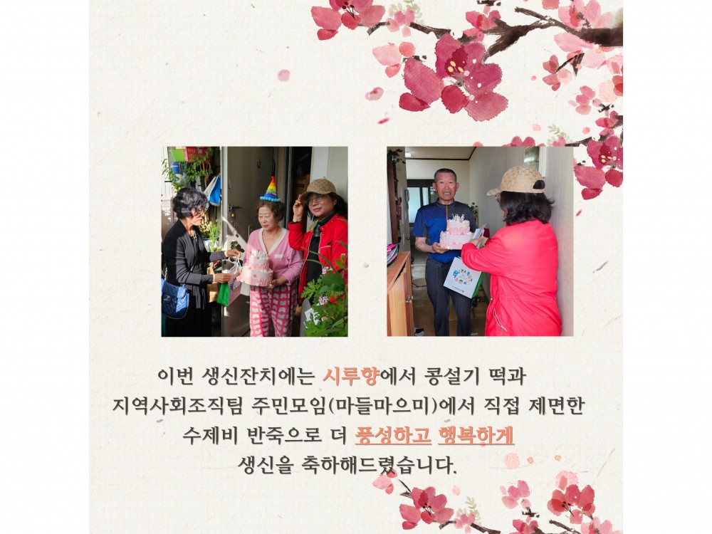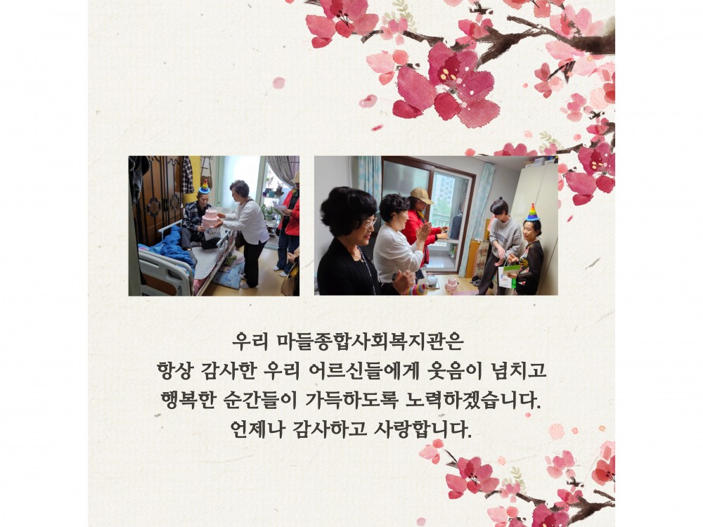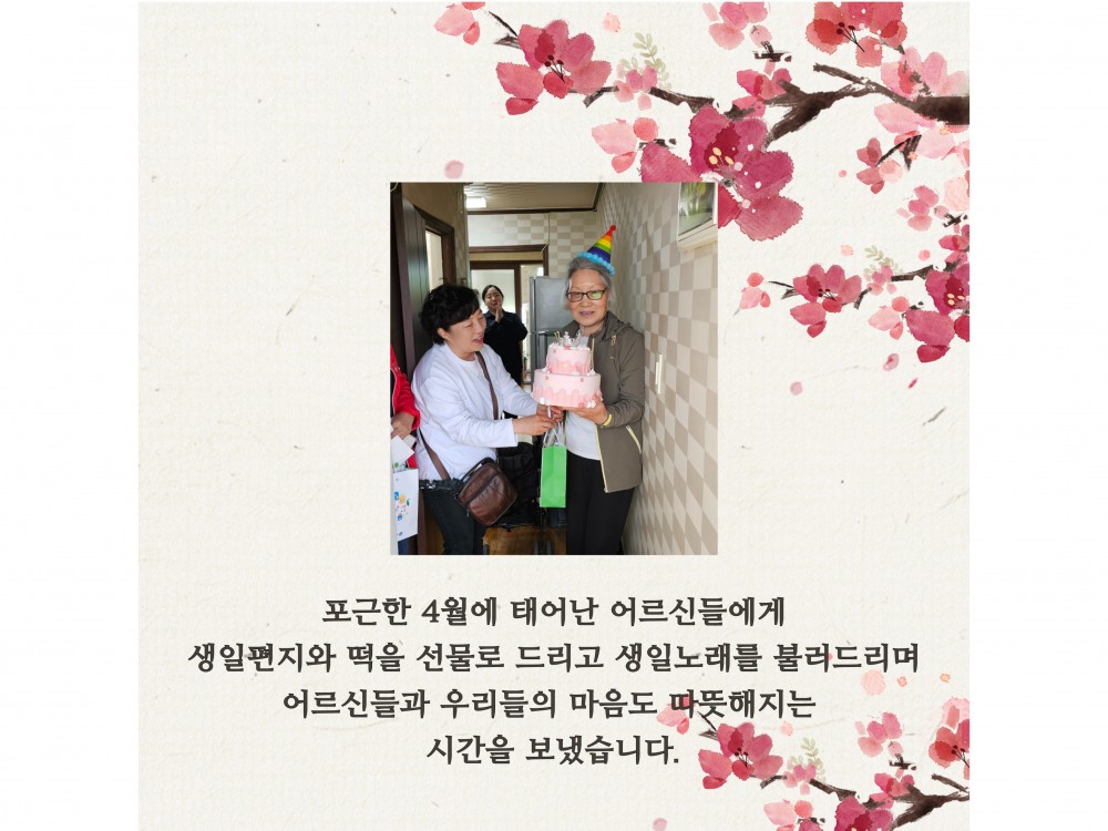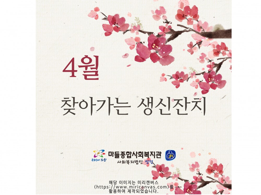 4월 '찾아가는 생신잔치' 페이지 정보 작성자 서비스1팀 작성일24-04-26 18:53 조회1,938회 댓글0건 관련링크 이전글 다음글 목록 본문 #벚꽃#어버이날#어린이날* 이 디자인은 미리캔버스에서 작업되었습니다.(https://www.miricanvas.com)글꼴 출처 : https://bit.ly/4aRZ60P 댓글목록 등록된 댓글이 없습니다. 이전글 다음글 목록