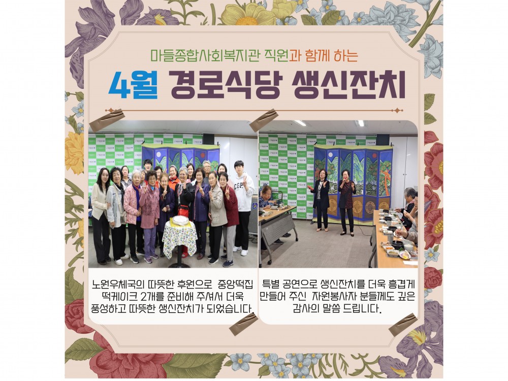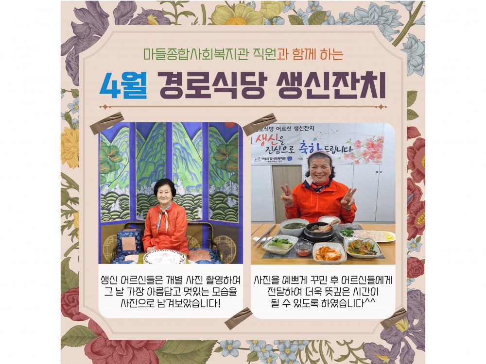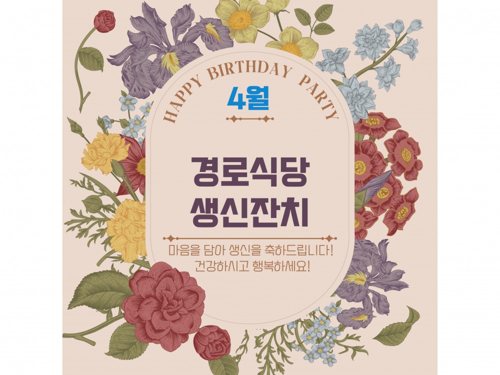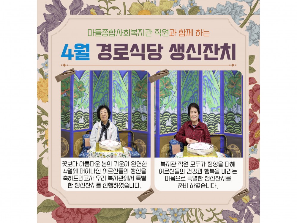 4월 경로식당 생신잔치 " 함께라서 더 행복한 생일" 페이지 정보 작성자 서비스1팀 작성일24-04-26 19:13 조회2,019회 댓글0건 관련링크 이전글 다음글 목록 본문 #벚꽃#어버이날#어린이날* 이 디자인은 미리캔버스에서 작업되었습니다.(https://www.miricanvas.com) 글꼴 출처 : https://bit.ly/4aRZ60P 댓글목록 등록된 댓글이 없습니다. 이전글 다음글 목록