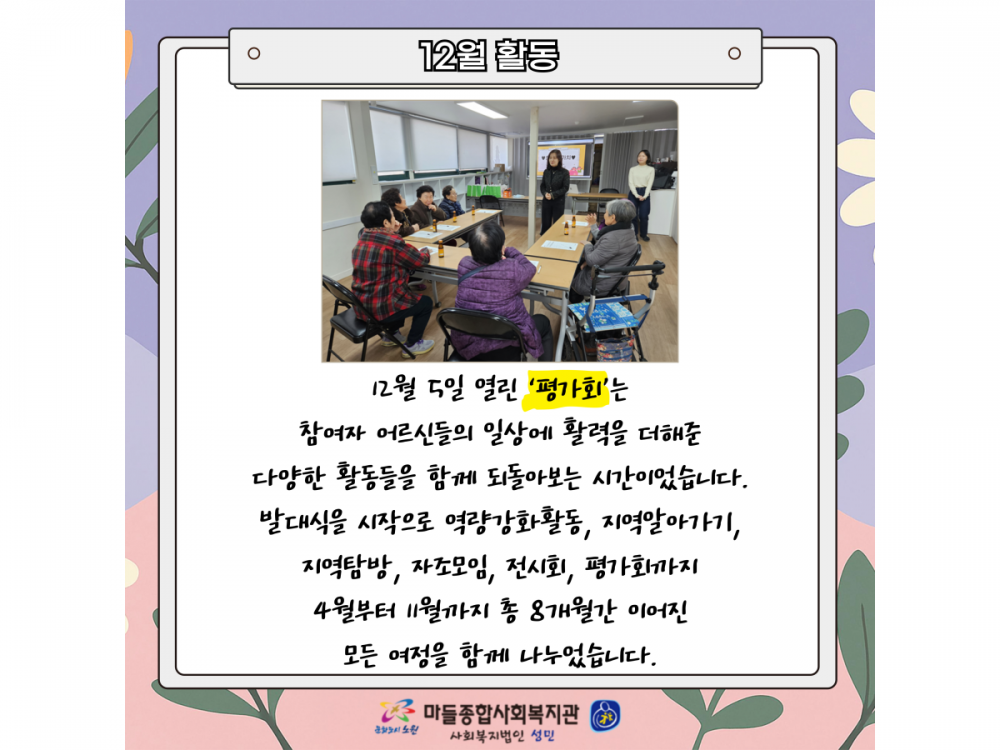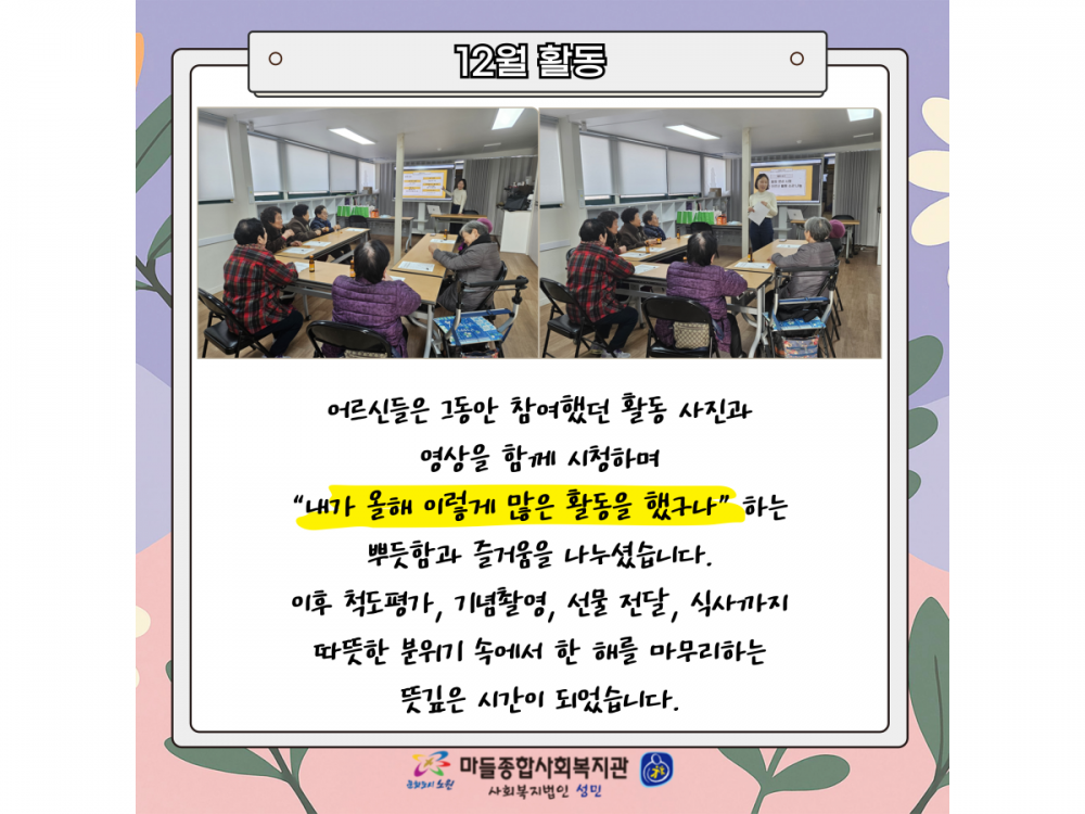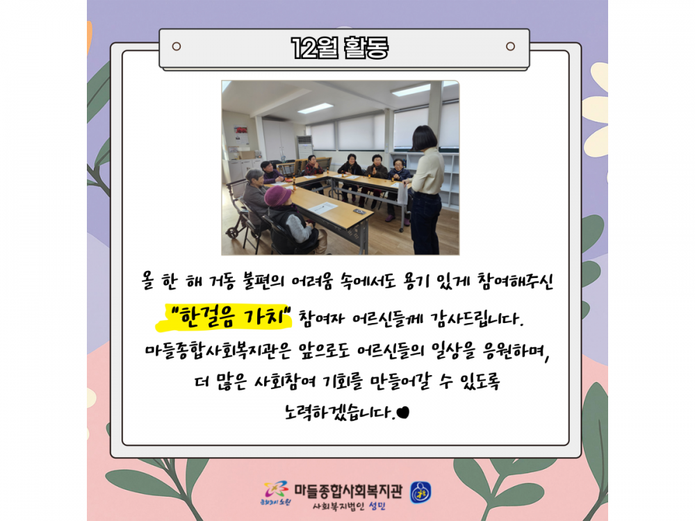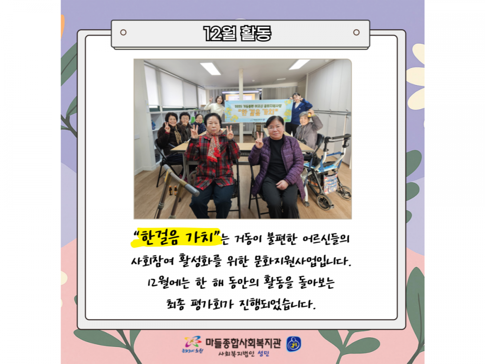 거동불편어르신 문화지원사업 '한걸음가치' 12월 활동 페이지 정보 작성자 서비스팀 작성일25-12-11 15:08 조회432회 댓글0건 관련링크 이전글 다음글 목록 본문 #크리스마스 #붕세권 #연말* 이 디자인은 미리캔버스에서 작업되었습니다.(https://www.miricanvas.com) 댓글목록 등록된 댓글이 없습니다. 이전글 다음글 목록
