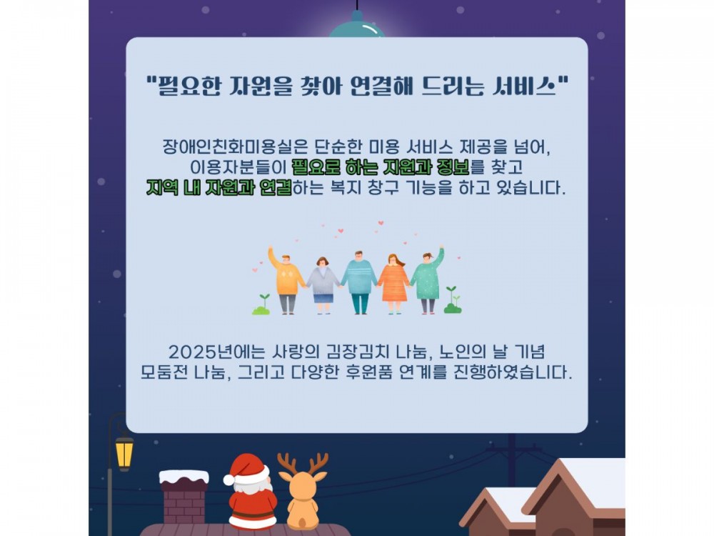 장애인친화미용실(공릉점) 2025년 자원연계 페이지 정보 작성자 시설운영팀 작성일25-12-22 20:54 조회334회 댓글0건 관련링크 이전글 다음글 목록 본문 댓글목록 등록된 댓글이 없습니다. 이전글 다음글 목록