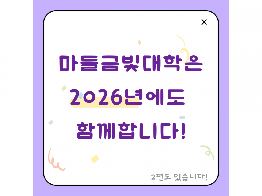 마들금빛대학 문해프로그램 하이라이트 페이지 정보 작성자 서비스팀 작성일25-12-23 14:51 조회311회 댓글0건 관련링크 이전글 다음글 목록 본문 #크리스마스 #붕세권 #연말* 이 디자인은 미리캔버스에서 작업되었습니다.(https://www.miricanvas.com) 댓글목록 등록된 댓글이 없습니다. 이전글 다음글 목록
