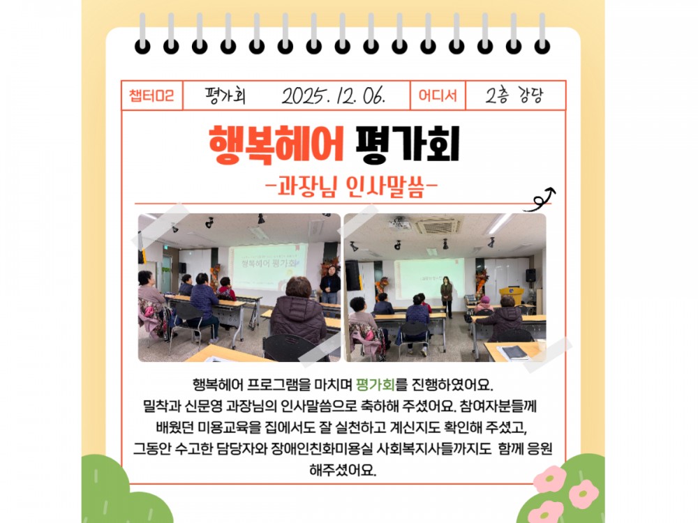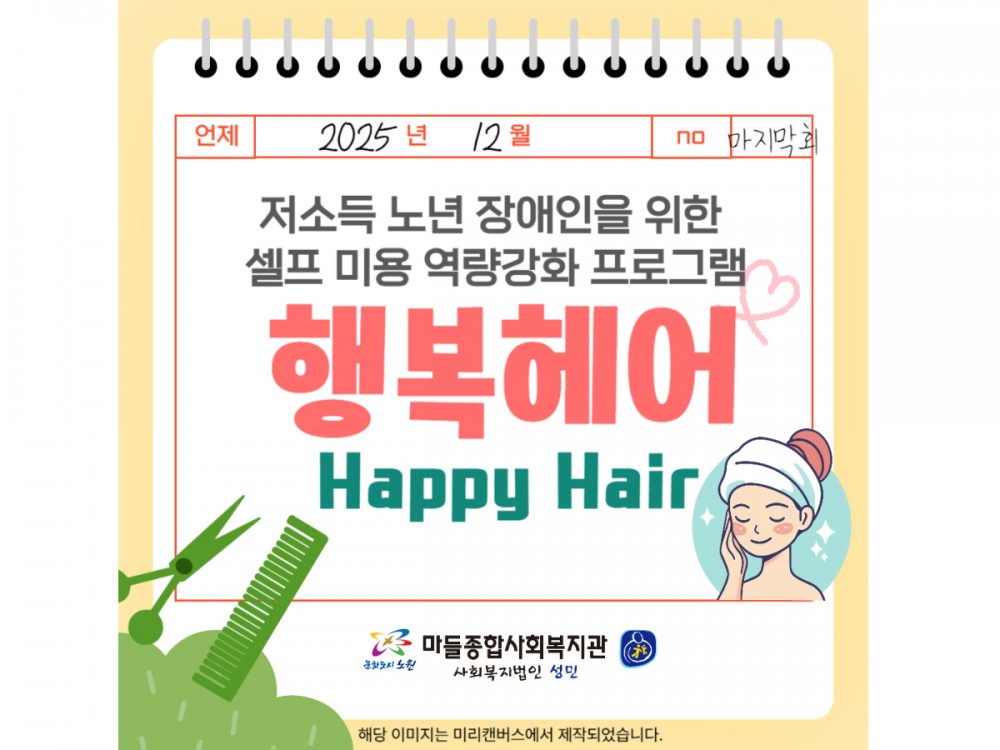 행복헤어 12월 활동 페이지 정보 작성자 시설운영팀 작성일25-12-06 22:39 조회516회 댓글0건 관련링크 이전글 다음글 목록 본문 #크리스마스 #붕세권 #연말* 이 디자인은 미리캔버스에서 작업되었습니다.(https://www.miricanvas.com)* 글꼴 출처 : https://bit.ly/4aRZ60P 댓글목록 등록된 댓글이 없습니다. 이전글 다음글 목록