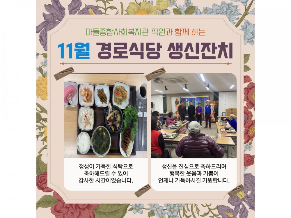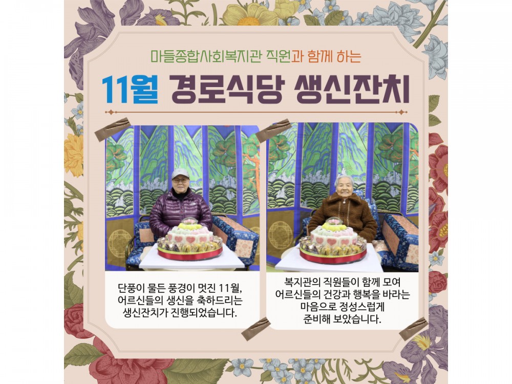 11월 경로식당 생신잔치 "함께라서 더 행복한 생일" 페이지 정보 작성자 서비스팀 작성일25-11-20 20:37 조회653회 댓글0건 관련링크 이전글 다음글 목록 본문 * 이 디자인은 미리캔버스에서 작업되었습니다.(https://www.miricanvas.com) 댓글목록 등록된 댓글이 없습니다. 이전글 다음글 목록