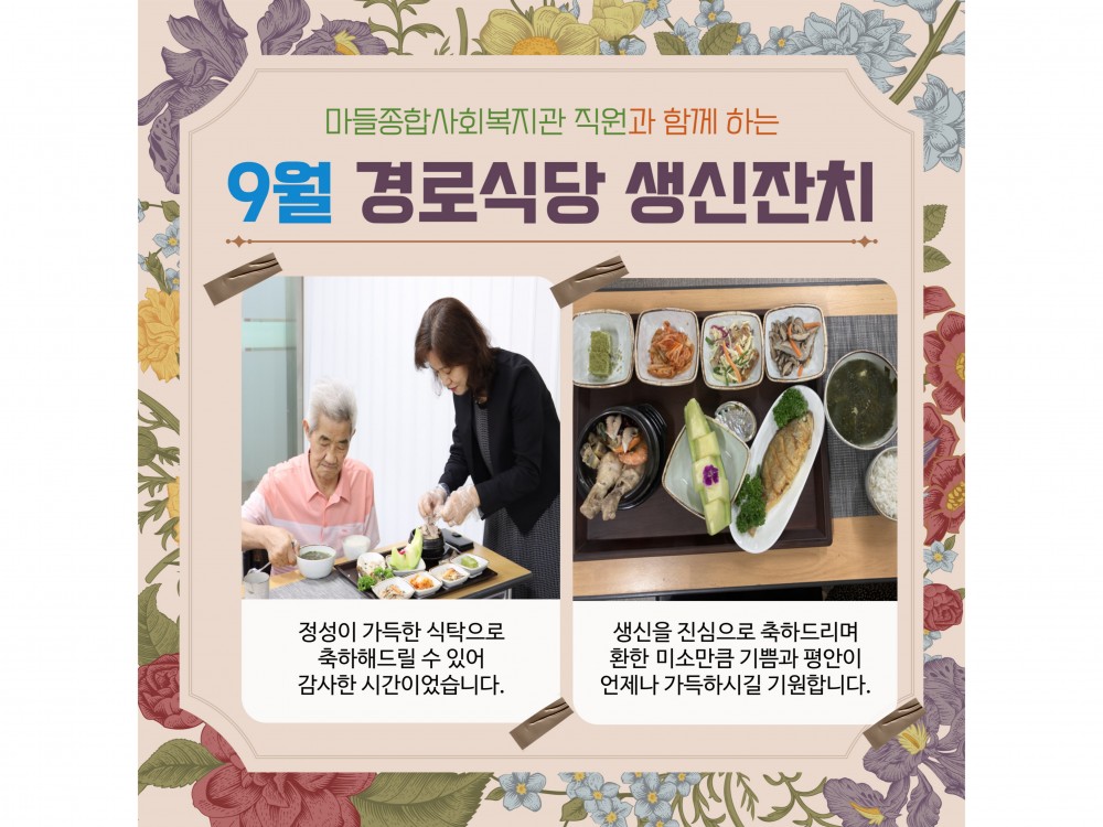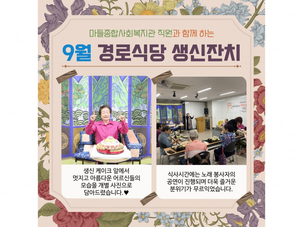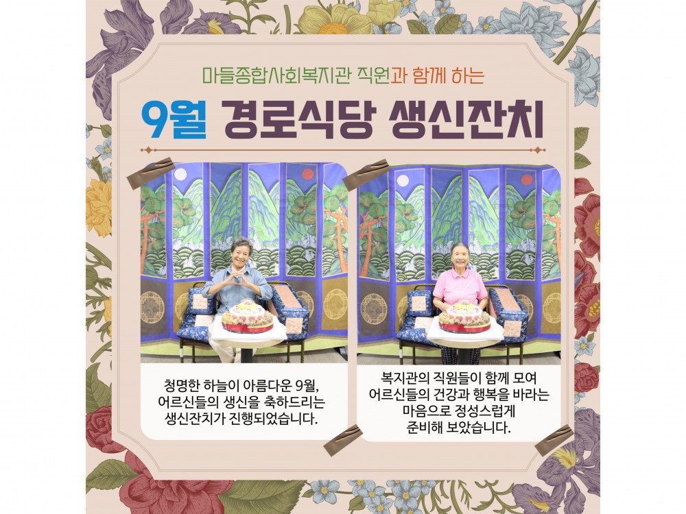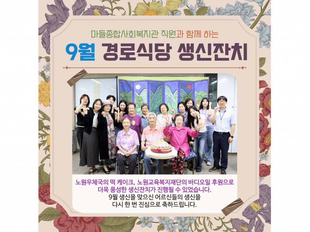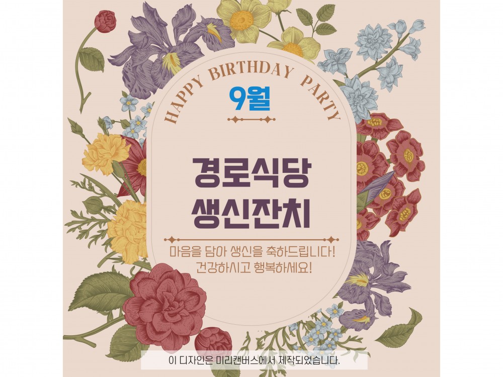9월 경로식당 생신잔치 "함께라서 더 행복한 생일" 페이지 정보 작성자 서비스1팀 작성일25-09-17 15:16 조회784회 댓글0건 관련링크 이전글 다음글 목록 본문 #단풍 #추석 #명절* 이 디자인은 미리캔버스에서 작업되었습니다.(https://www.miricanvas.com)* 글꼴 출처 : https://bit.ly/4aRZ60P 댓글목록 등록된 댓글이 없습니다. 이전글 다음글 목록
