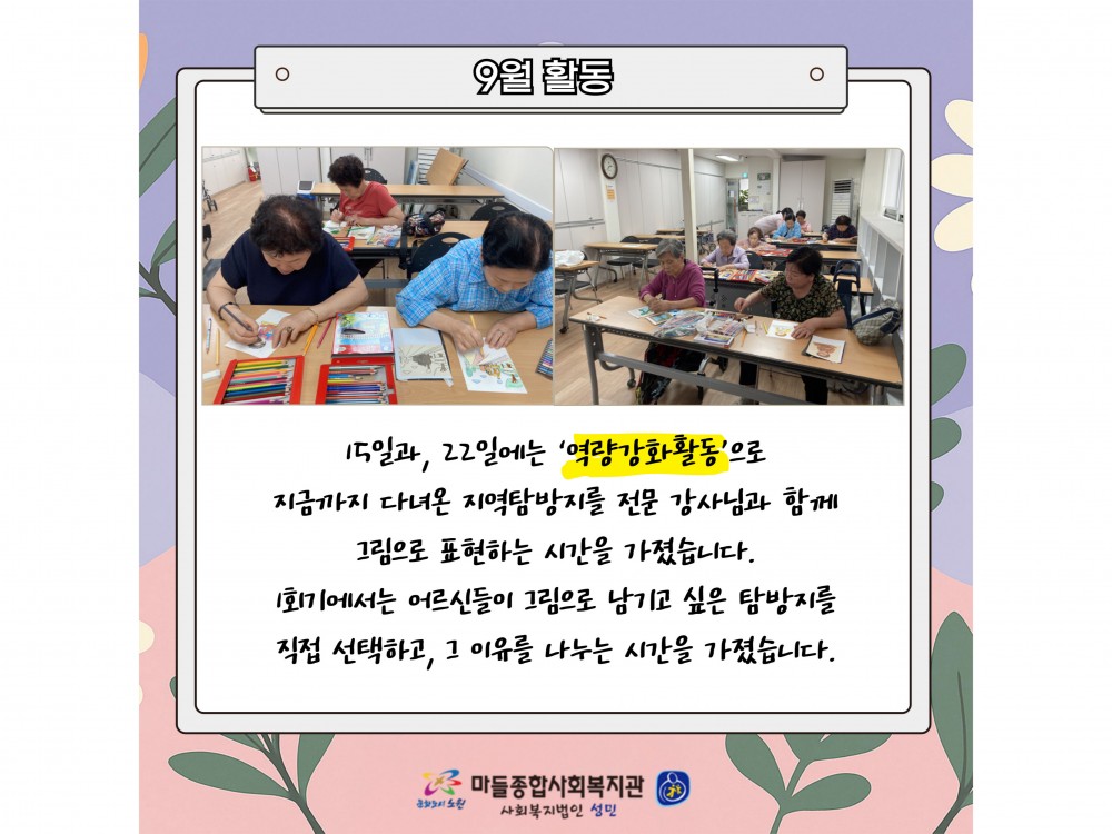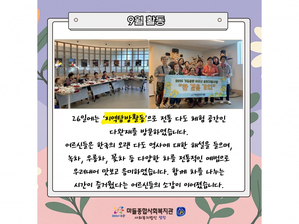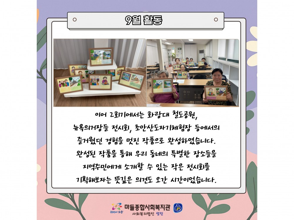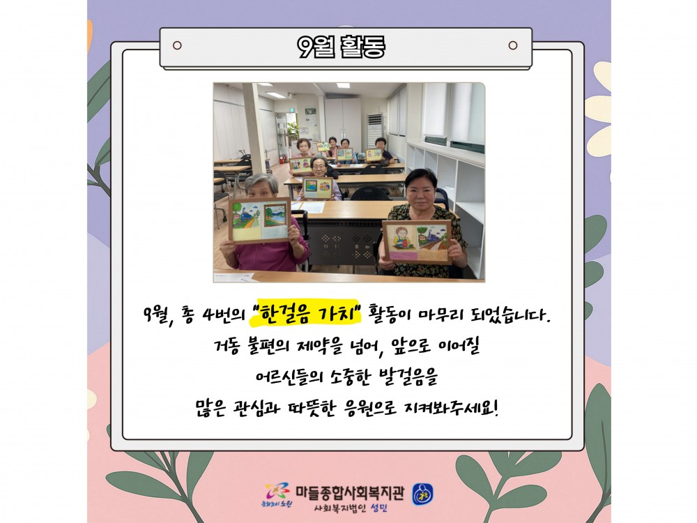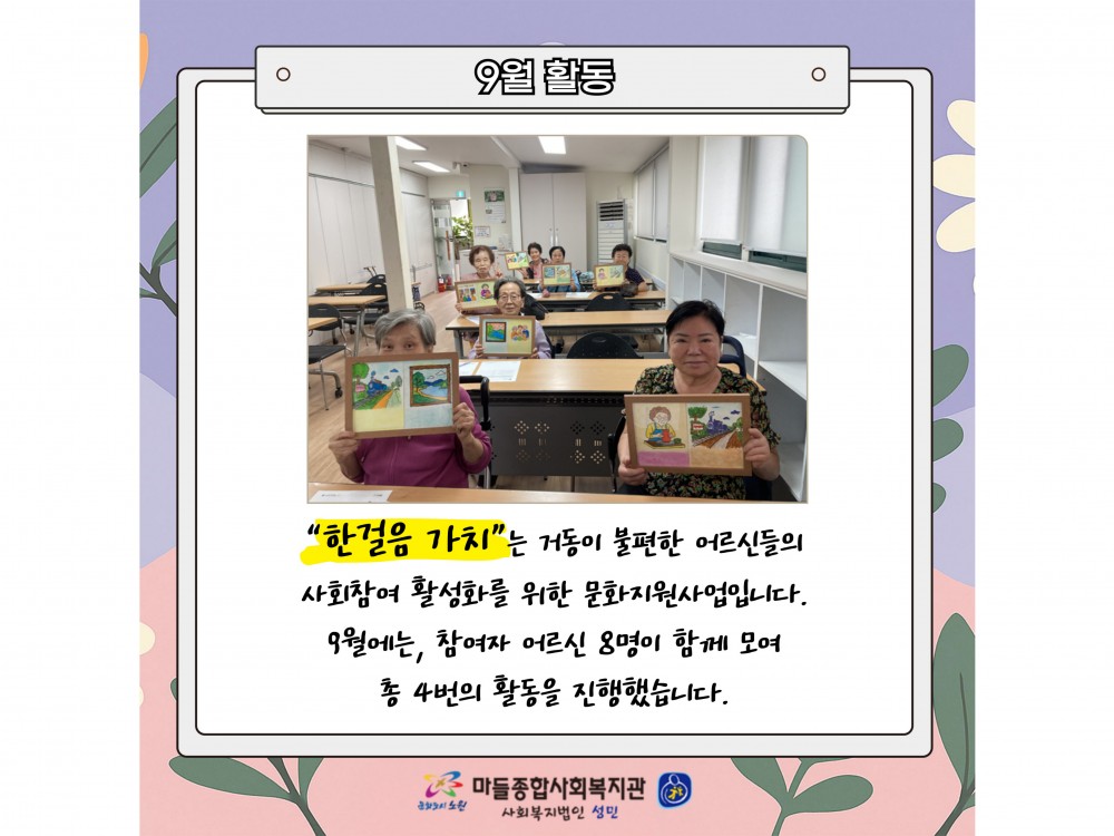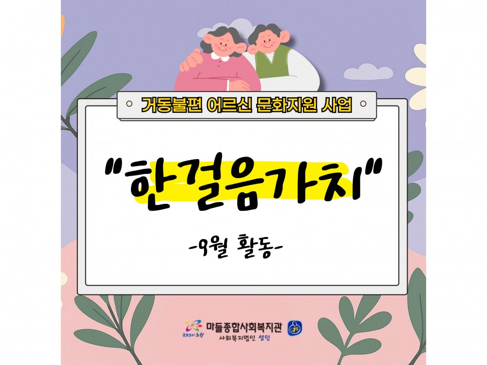 거동불편어르신 문화지원사업 '한걸음가치' 9월 활동 페이지 정보 작성자 서비스1팀 작성일25-09-30 19:37 조회707회 댓글0건 관련링크 이전글 다음글 목록 본문 #단풍 #추석 #명절* 이 디자인은 미리캔버스에서 작업되었습니다.(https://www.miricanvas.com) 댓글목록 등록된 댓글이 없습니다. 이전글 다음글 목록