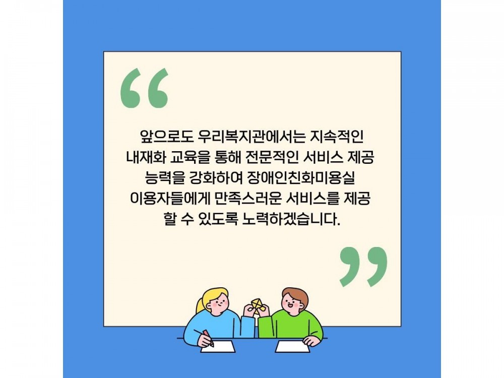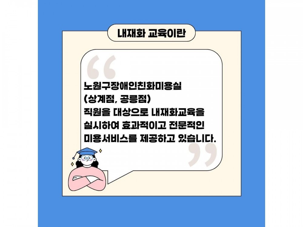 장애인친화미용실 내재화 교육 페이지 정보 작성자 시설운영팀 작성일26-02-06 01:57 조회154회 댓글0건 관련링크 이전글 다음글 목록 본문 댓글목록 등록된 댓글이 없습니다. 이전글 다음글 목록